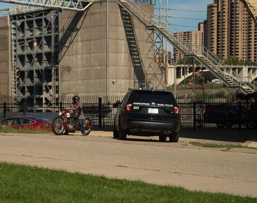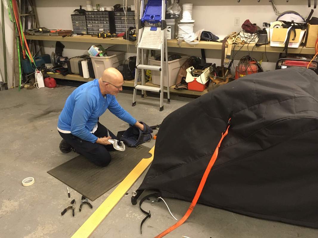 I got the bike into a few shows for later this winter. A couple are in the the Twin Cities; Progressive and Donnie Smith. Also getting ready to head for Portland OR for the One Moto Show in Feb. Really looking forward to that one. Decided on getting a cover made for the trip. This is Ron of SuperFit boat covers fitting snaps to attach the cover to the wheel chock. It was too dark to get a good pic of it all loaded up but it fits great.