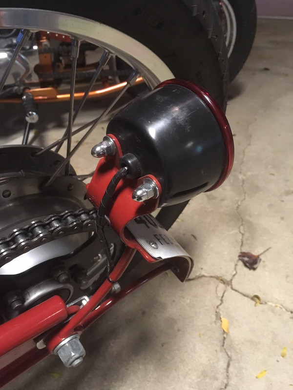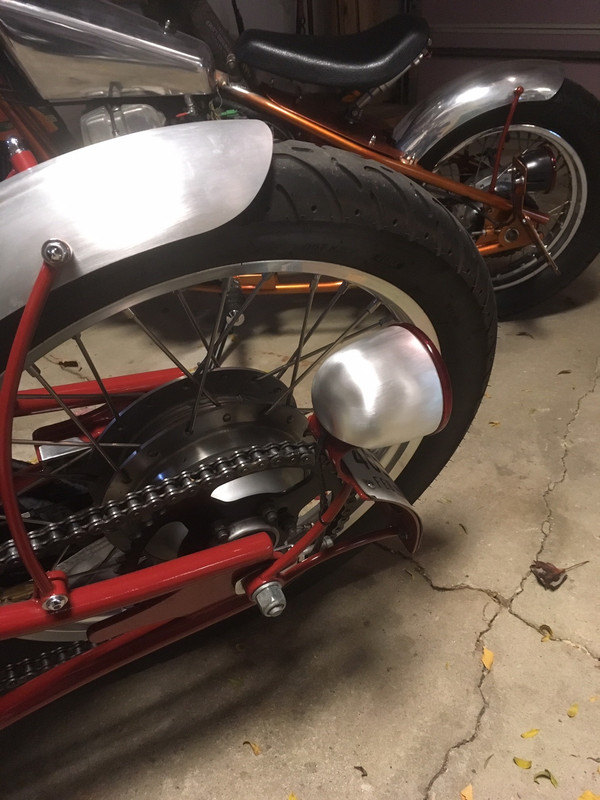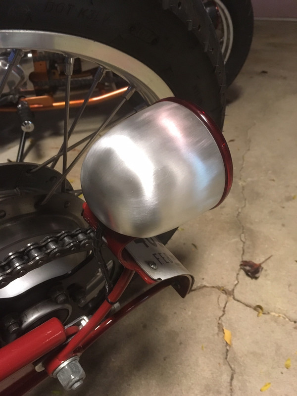 A few more details. I made a small cap to dress up the trailer tail light. It just slips on over the plastic housing and butts up to the red lens. Not many in process pics but it consists of a cylinder with a cap. All hammer and dolly work due to the small size. And polished up the right side engine case, for some reason it had a lot of corrosion through the clear coat on the top side.