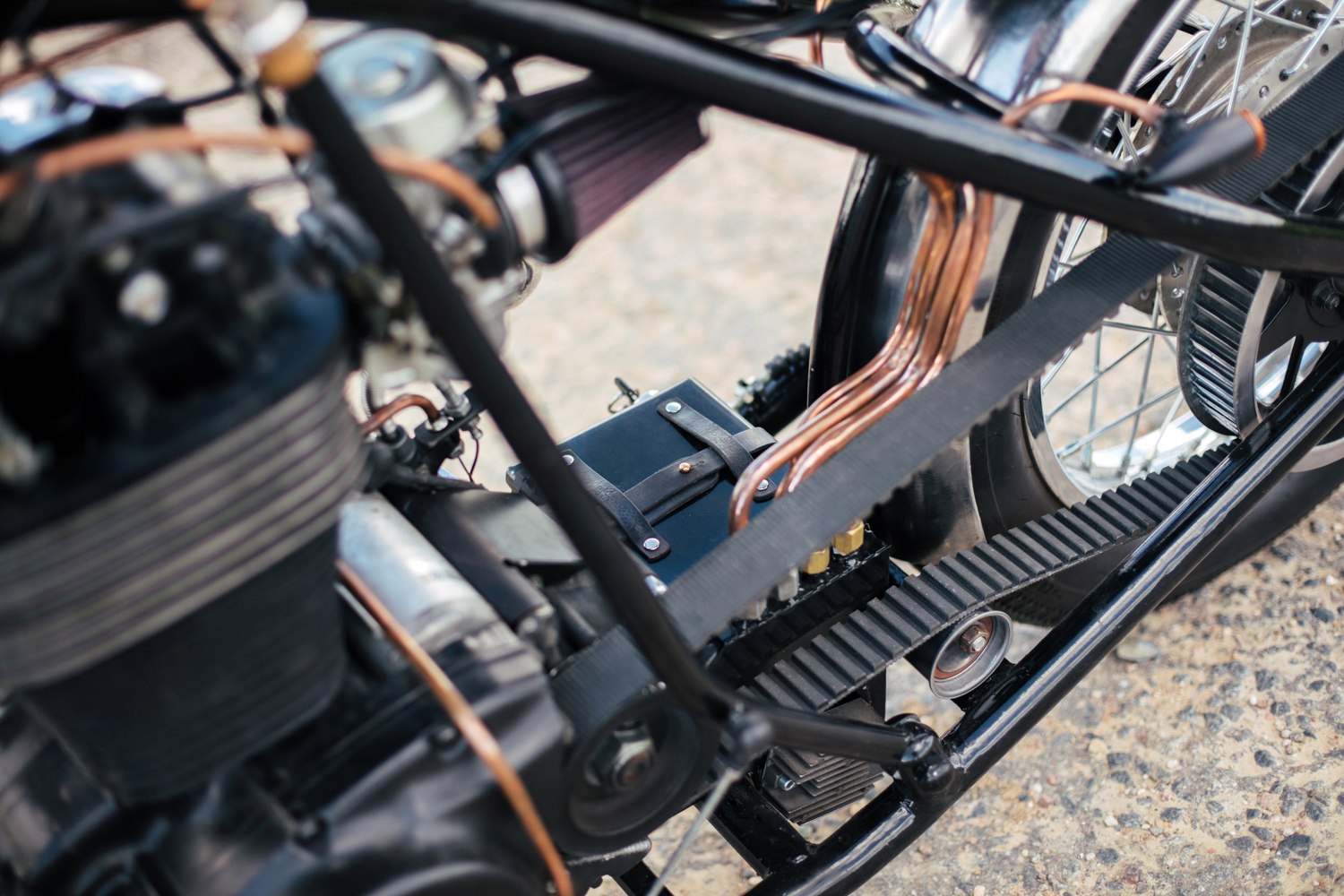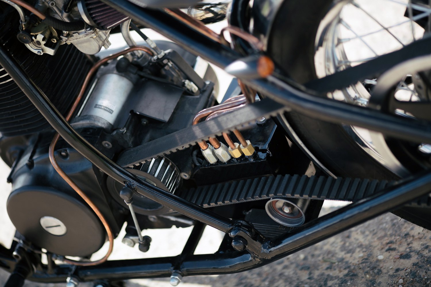 The kickstand would work a bit better if the end touched the ground,and the front of the spring held on with wing nuts ?How many bumps before they fall off? and why the guide on the belt ?It's a hardtail.How do you lube the steel cable running from the foot pedal clutch ? how long before the cable running around all the bends ,saws through the copper and jams? It's a show piece ,I wouldn't be taking it on any long trips.