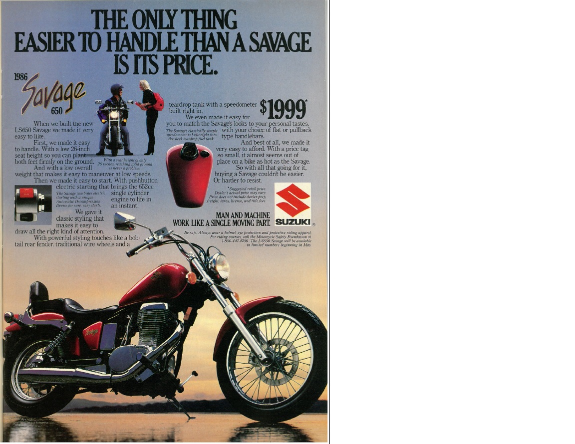 A friend of mine handed me a July 1986 copy of Cycle World. In this magazine is a Savage ad that I'm sure didn't see many inserts.