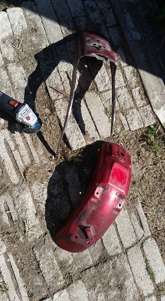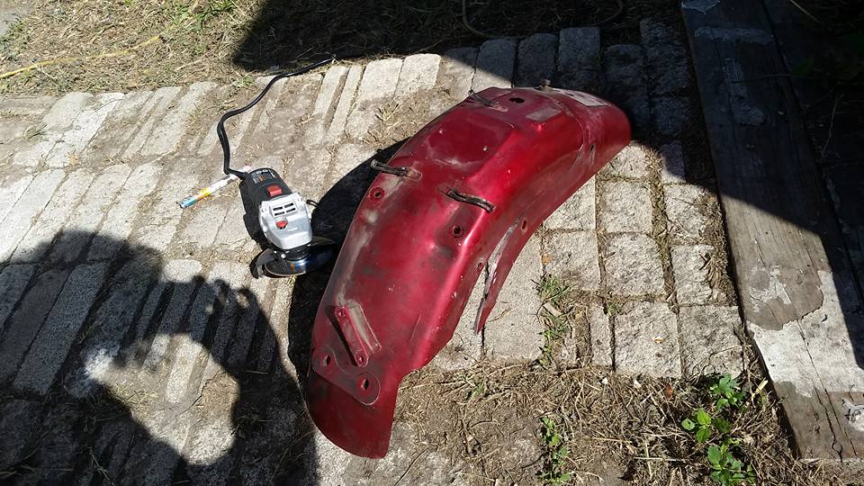 I went with a little conservative finesse while chopping the rear fender. I wanted to lose some of that ridiculous weight and length while still maintaining the ability to hang bags from somewhere. I'm really looking at a pair of 20mm ammo cans for that job. I drew my mock up lines with welding layout chalk freehand... and cut it with a 4" harbor freight angle grinder with a cut off wheel. Deburred, contoured, smoothed and finished the lines with a harbor freight 4" flapper disk on the same angle grinder. Gave the paint a good scuff, hit it with the acetone... and rattle canned it with krylon.