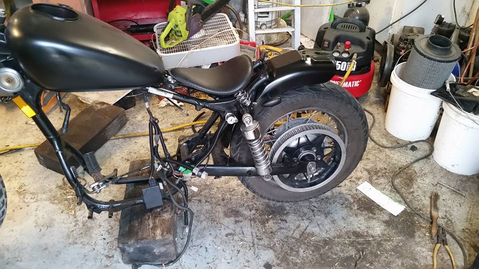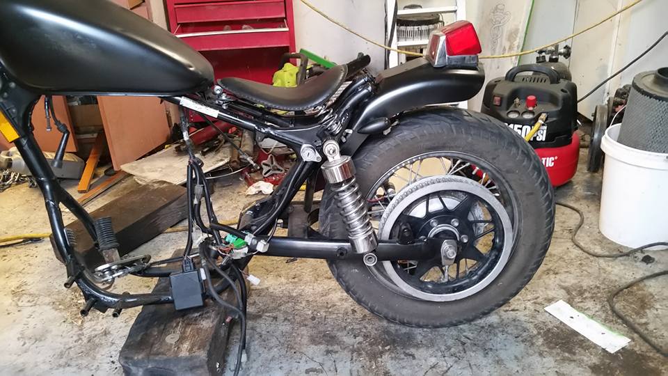 Mounting the solo seat was as easy as chopping the stock seat bolt brackets off the frame and welding in some gussets I made from some 1" flat stock. Drilled a hole in each gusset for a hex head bolt to fit into from inside and sticking out the bottom of the spring... wingnut on the other side of the gusset that backs against the rear fender... very difficult to get to so I don't have to worry about drunk bums trying to steal souvenirs in the middle of the night lol.