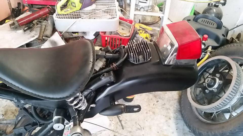 Stock saddle, turn signals, airbox, rear pegs, rear signal bracket arms, and about 10lbs of the rear fender are gone.