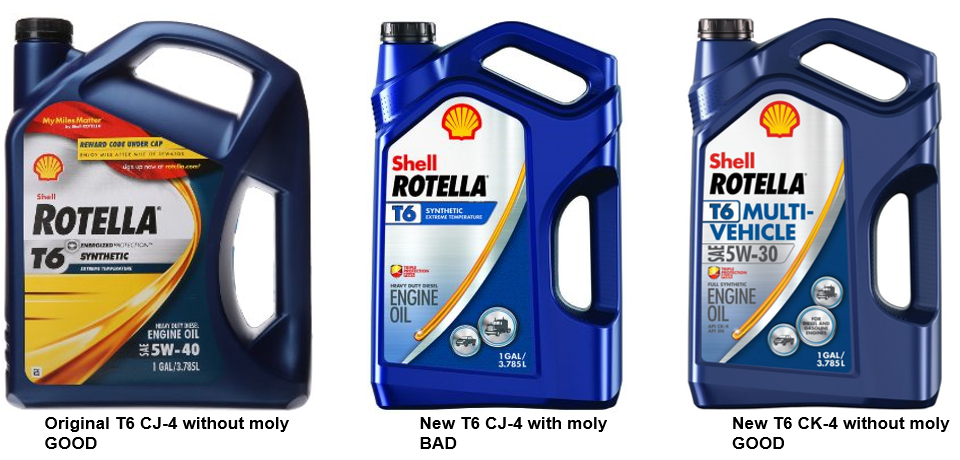 Recently the "new" Rotella  T6 came out and it was a reformulated version  of the CJ-4 we had been using, and it is in the taller redesigned bottle.  The amount of moly in the oil was increased, and some  long term users of T6 started to experience clutch slippage issues.  (If you can use this oil and not have a slippy clutch....great!)