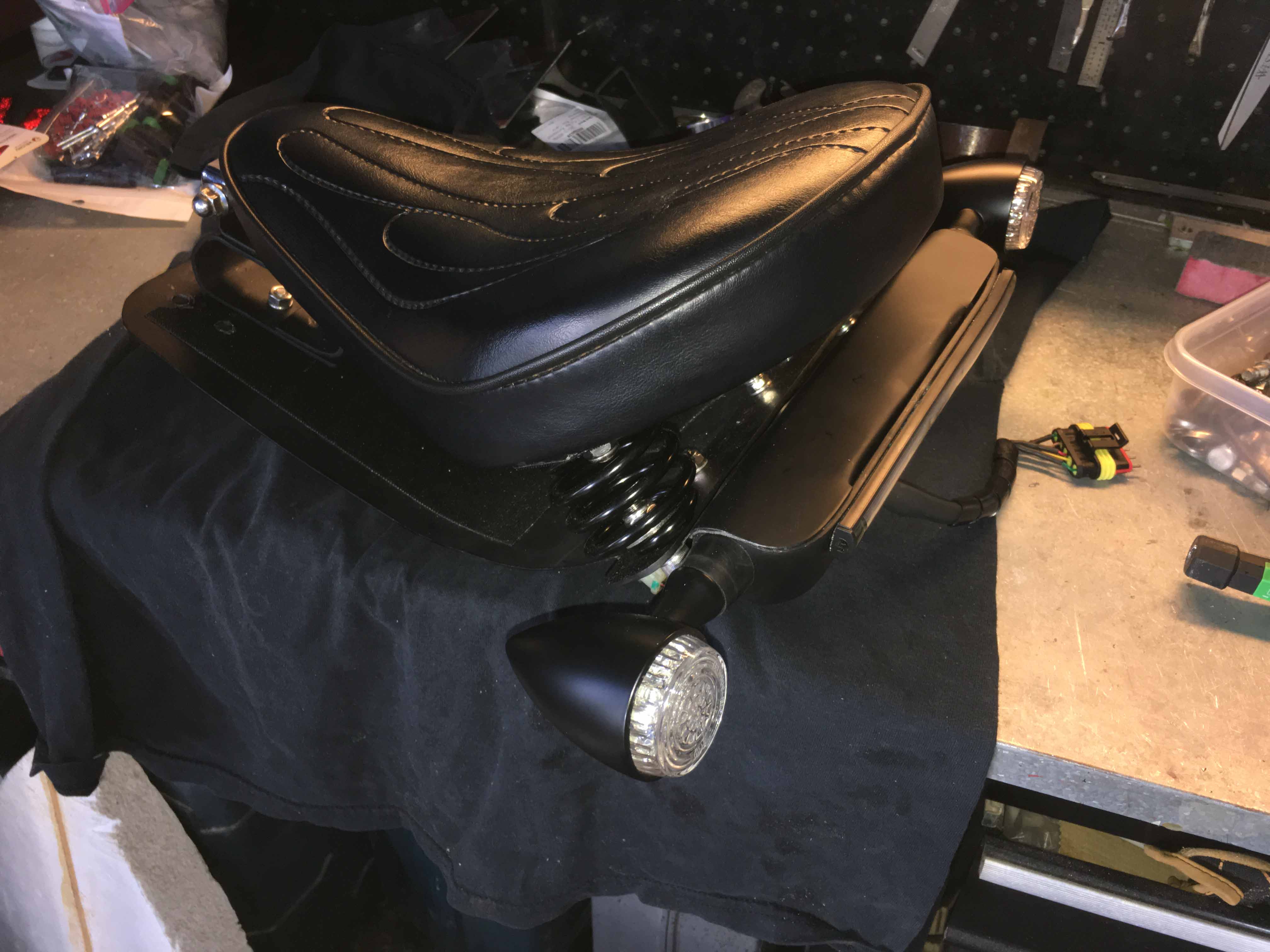 I made a steel seat pan for my solo seat and integrated the turn/tail lights with a single 5-pin multi plug. Most of the bike's wiring lives under the seat pan (there is an aluminum cover beneath it, making the void under the seat pan a protected little wiring area).