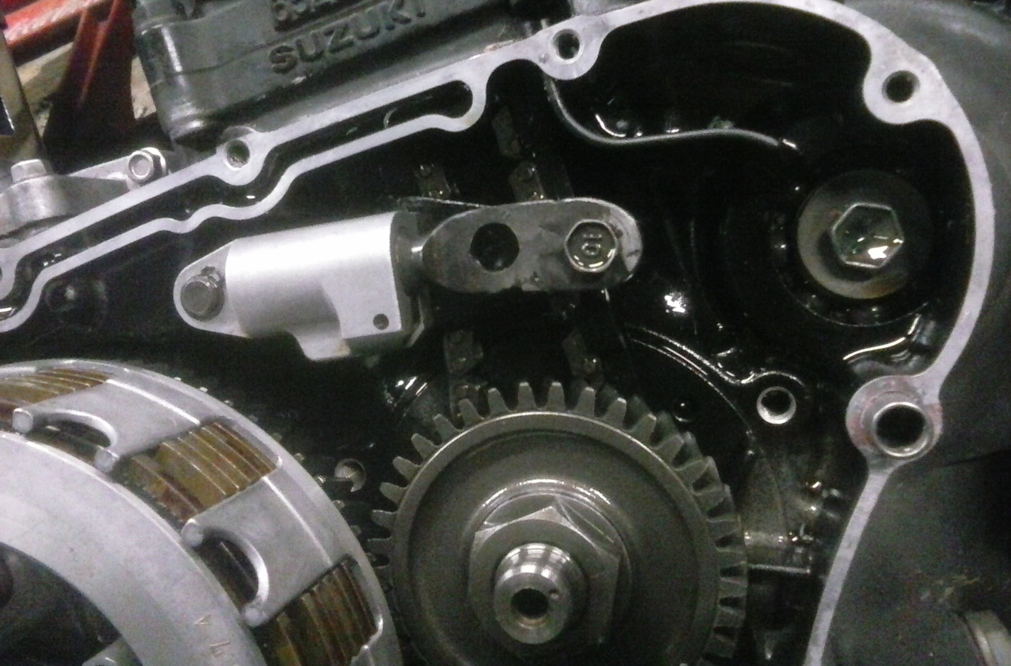 Ya'll may not believe this ... : when I first got my current S-40 it had less than 5,000 miles . One of the first things I did was to modify the cam tensioner w/extention hole and softer spring (1/3 as strong). Now the bike has right at 40,000 miles and here is a picture of what the tensioner looks like now. I put a new clutch disk in last week and it might be one more click than the picture. Two clicks out and quiet and happy !