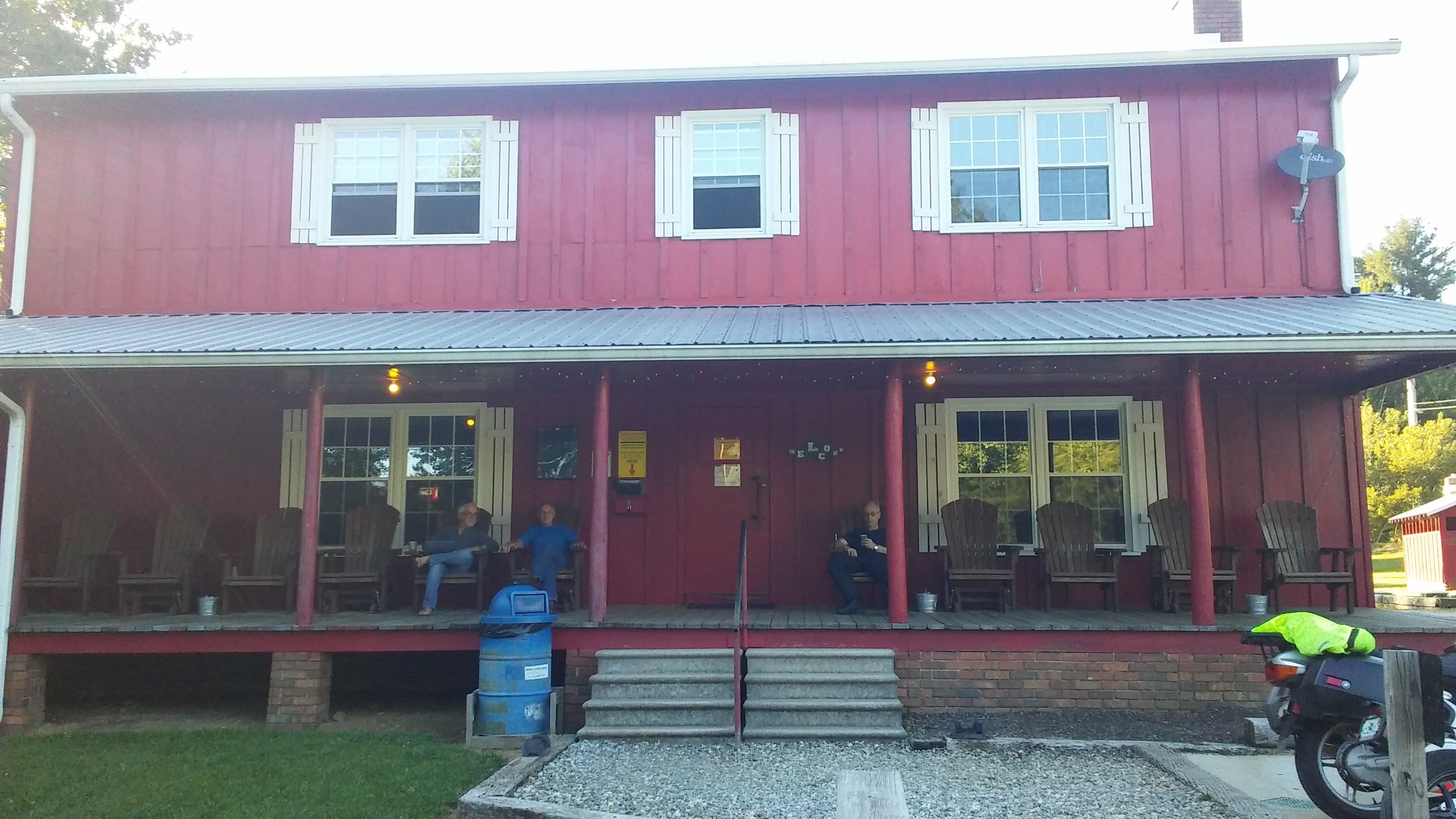 To reach the campsite pull into the concrete parking lot, then go right on the gravel road past the lodge. Cross over the first bridge, then when you cross the second water crossing it is a big culvert. The red bath house will be straight ahead - but turn right before you get to it. You will see thee firewood storage area.....keep looking right. I am right next to the creek in a faded blue Coleman tent that has a tan/yellow fly on top.