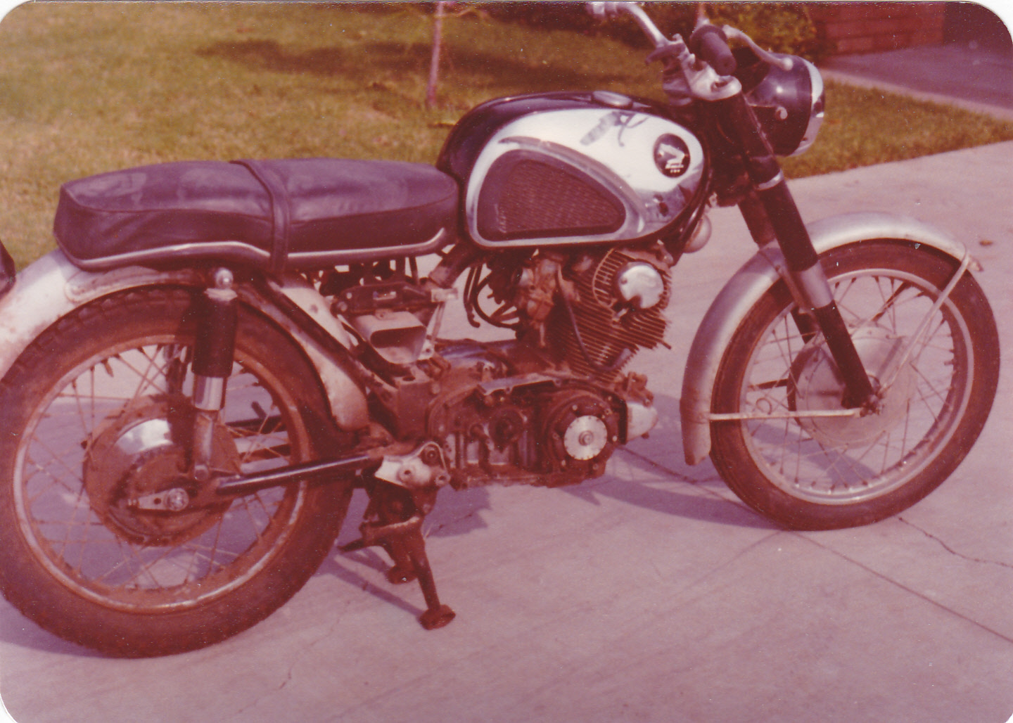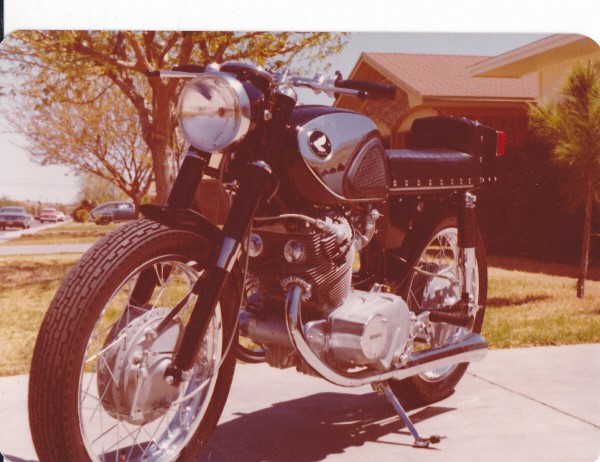 The bike was a Honda CB77 Super Hawk, 1966 I think. I had no title so can't be sure. I bought it in 1976 however. It was "interesting" getting the paperwork straight. The Texas authorities were finally convinced when I produced the before and after pictures, invoices and, of course, the finished bike.