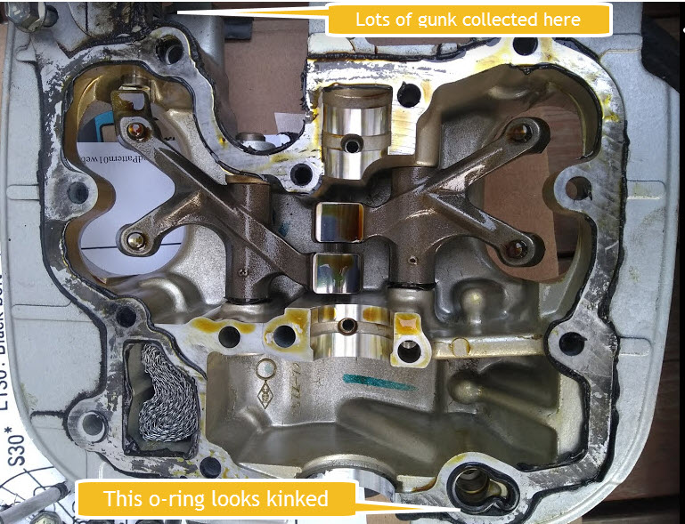 When you removed the head cover, did it seem like it was stuck down well with the adhesive that should have been used to seal it ? And especially on the side with the gunk ?