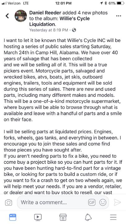 Re: HUGE Motorcycle Salvage Sale in AL - March 24t
