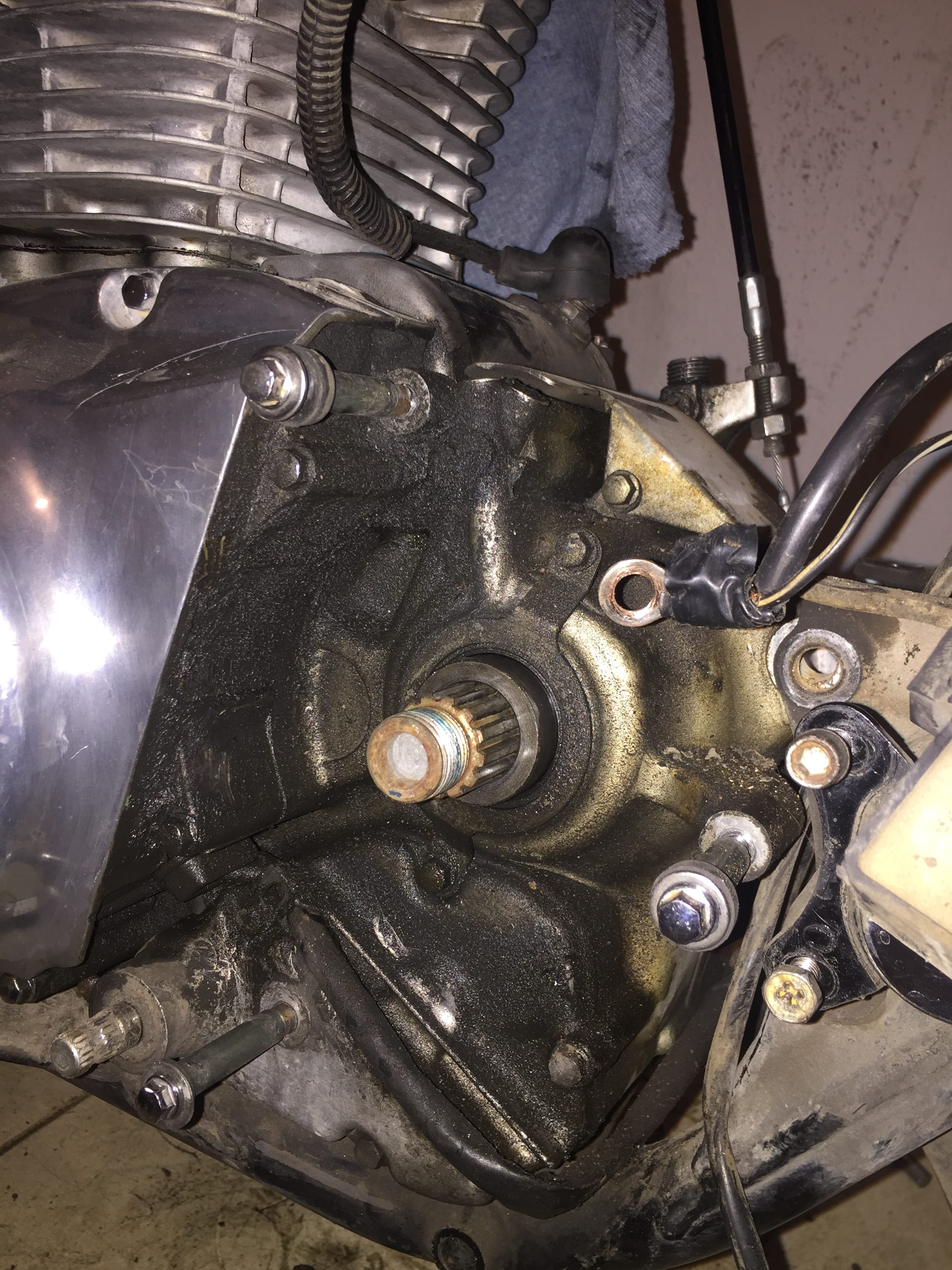 I'm trying to replace the oil seals on the main drive shaft. I'm stumped by how to pull that spacer you see on the spline. Parts diagrams show it to be smooth OD but it does not want pull out and I can't seem to get a grip on it. I have new parts for both the o-ring that's hidden under the spacer and the larger seal that you can see. I'm so far resisting the urge to dig out the larger seal as I don't want to damage the spacer or crank case.