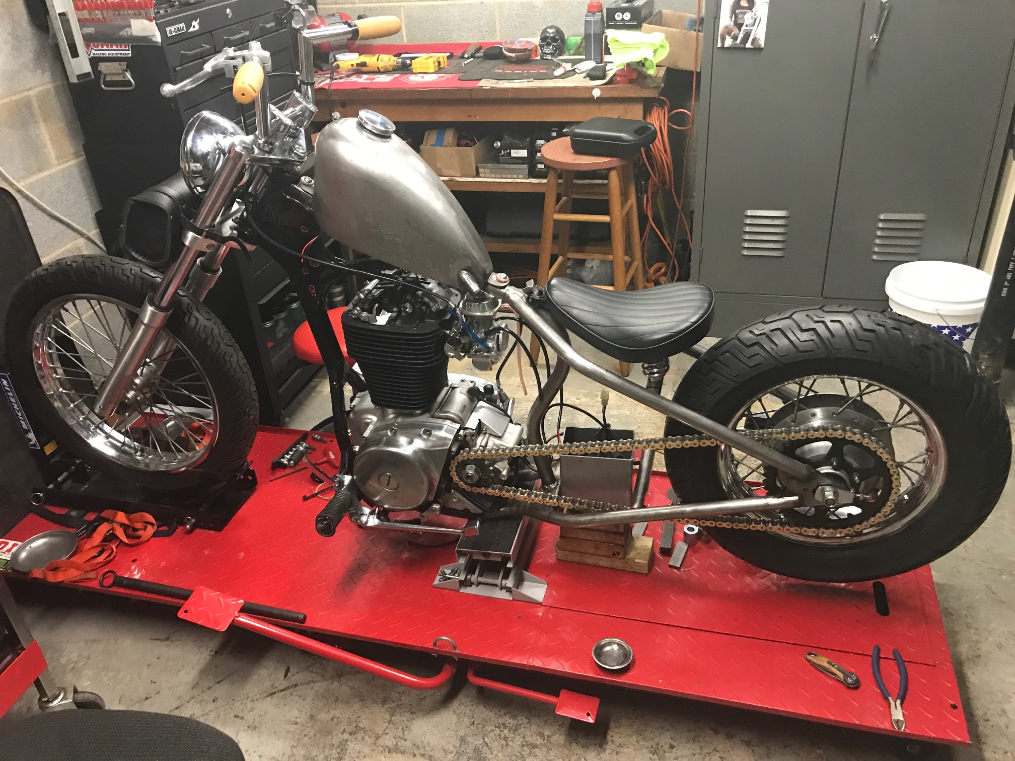 Finally got the motor back together, new cam, rocker arms, everything re-gasketed. Got the motor in the frame with the carb mocked up. Then got the elec. box somewhere in the area where i wanted.
