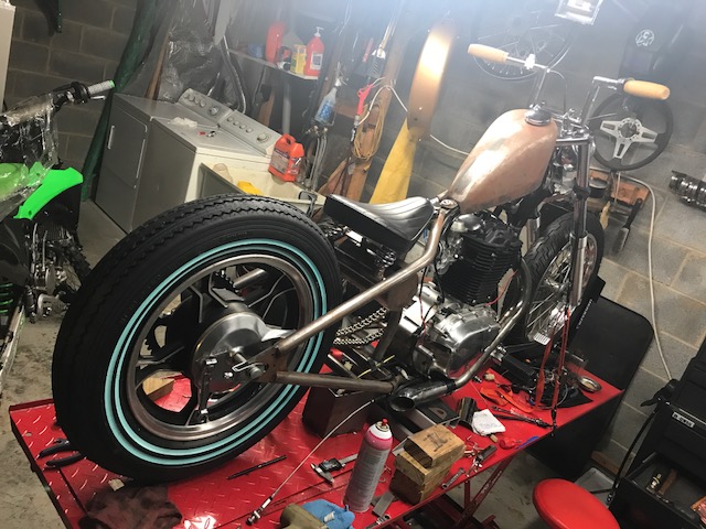 Decided to go with a 16" 1983 Gs550 rear mag wheel because of the low clearance with the stock 15" wheel. The brake drum and sprocket carrier attach right on. Also got my vintage style double thin whitewall tire. Still having some issues getting the wheel/drive centered.