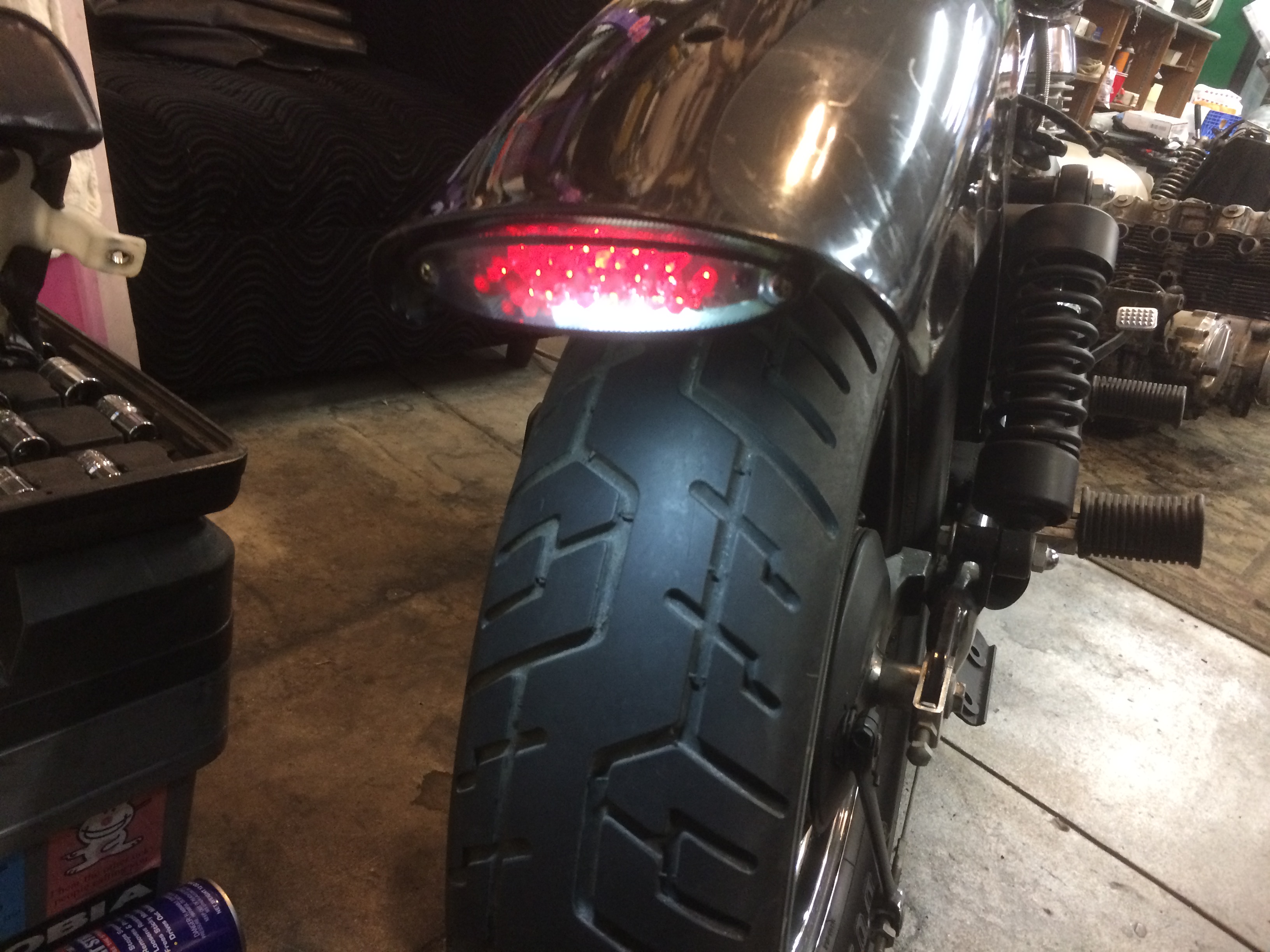 On the Suzuki Cafe' I added a supplemental brake light under the fender that is really bright, and on the Ninja Cafe' I added a controller that uses the rear turn signals as brake lights (red lenses on the rear turn signals)