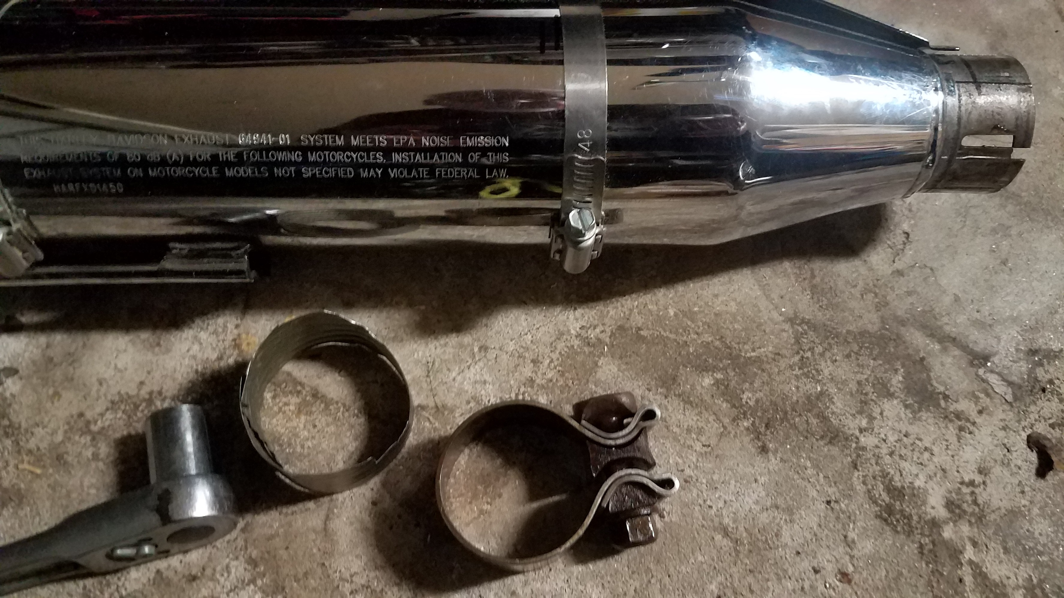 But when reinstalling, first attach the header pipe (loosley, so it can still rotate) then get the muffler in position and attach (loosley). I only used one bolt, and loktite, because it doesn't line up exactly with the muffler rail. Then attach the heat sheild (very loosley). Then you can rotate the header a little, and jiggle the muffler to get it lined up the best you can. I slipped the home-made Hadley in at this point and got in position as best I could. Then make sure the heat sheild still lines up well enough. My header is slightly rotated away from the bike after all is said and done.