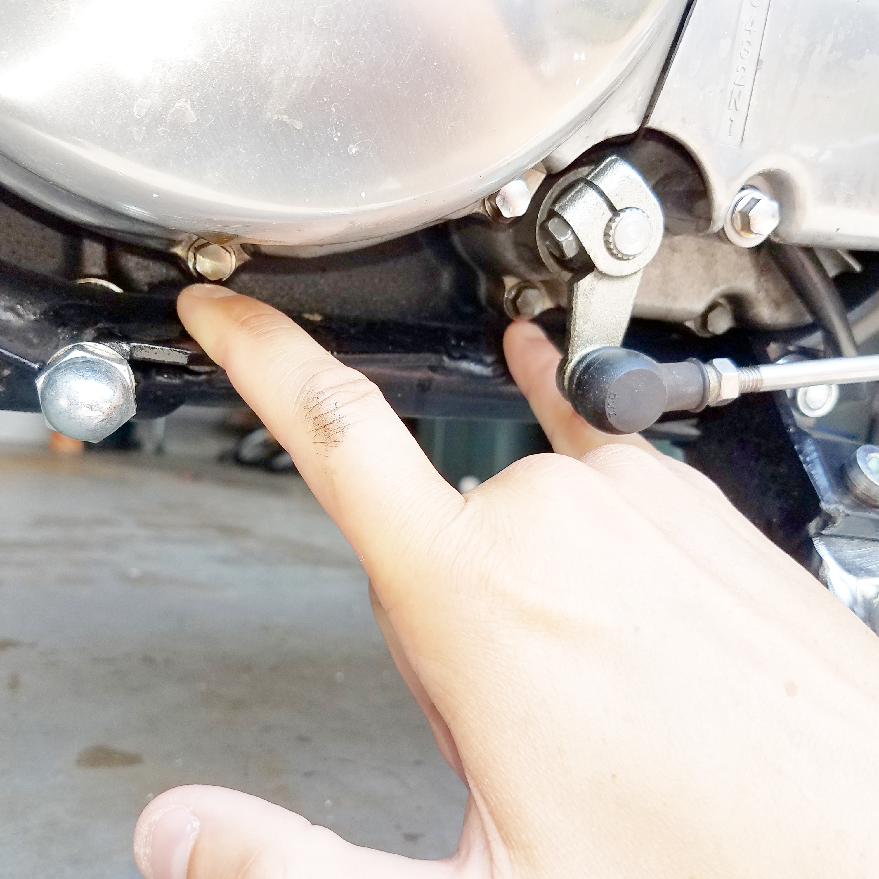 I have an oil leak under the left side of the crank case.  Pretty sure the source is the two bolts I am pointing at in the picture.  I plan to tighten these two bolts as my first plan of attack.  They look like a size 8 but can anyone confirm the size?  10 is the smallest I have, so I want to confirm size before purchasing a new socket.