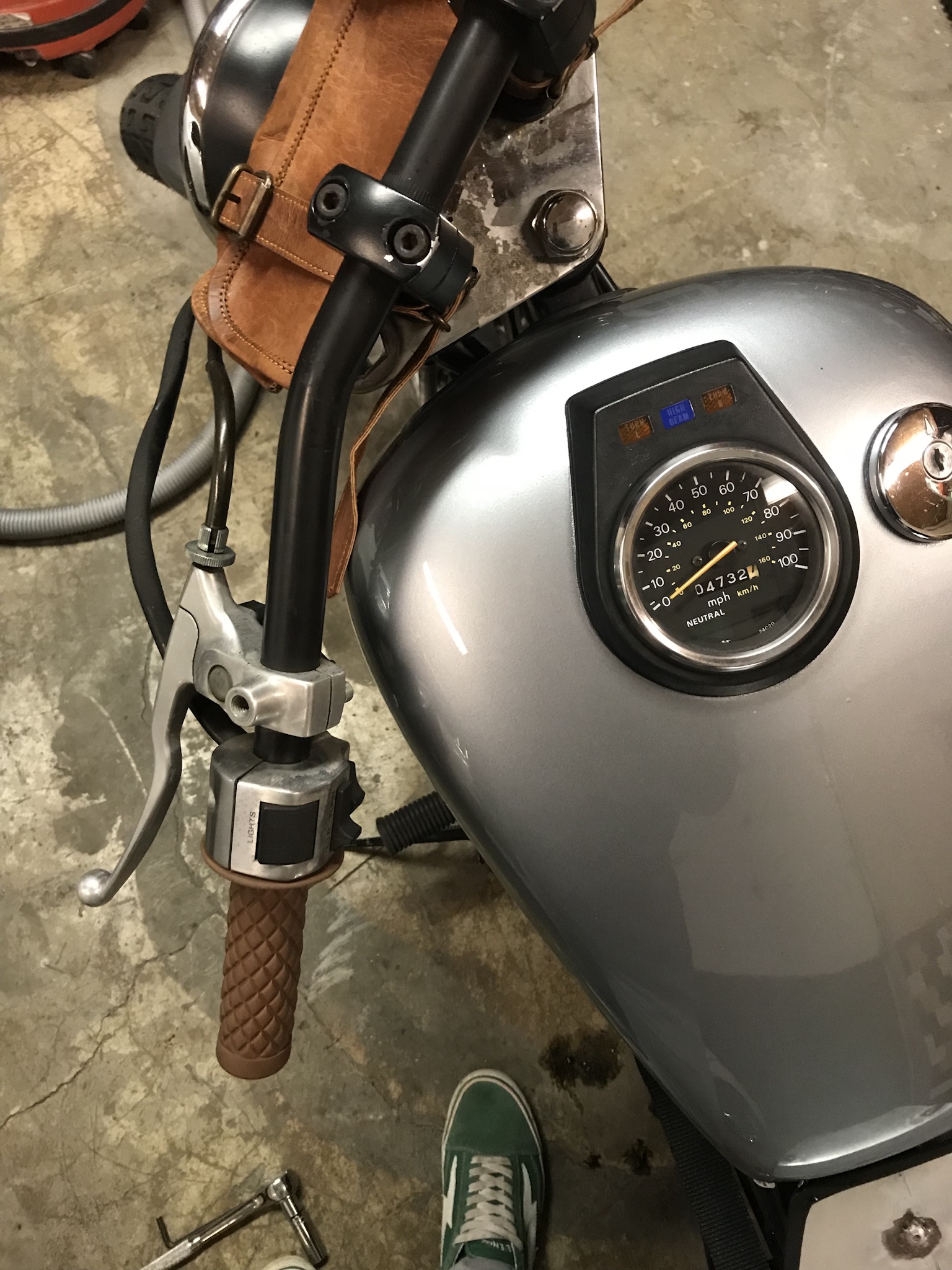 I got some brown grips because eventually ill have a brown toolbag on the forks and my seat will be brown leather as well. It should all match nicely, when its done. I have one problem with the drag bars on the bike. when I turn all the way left or right the brake mounts hit my tank. I need some kind of stopper to limit my turning. I may just flip the risers to face forward I think that will give me enough clearance.