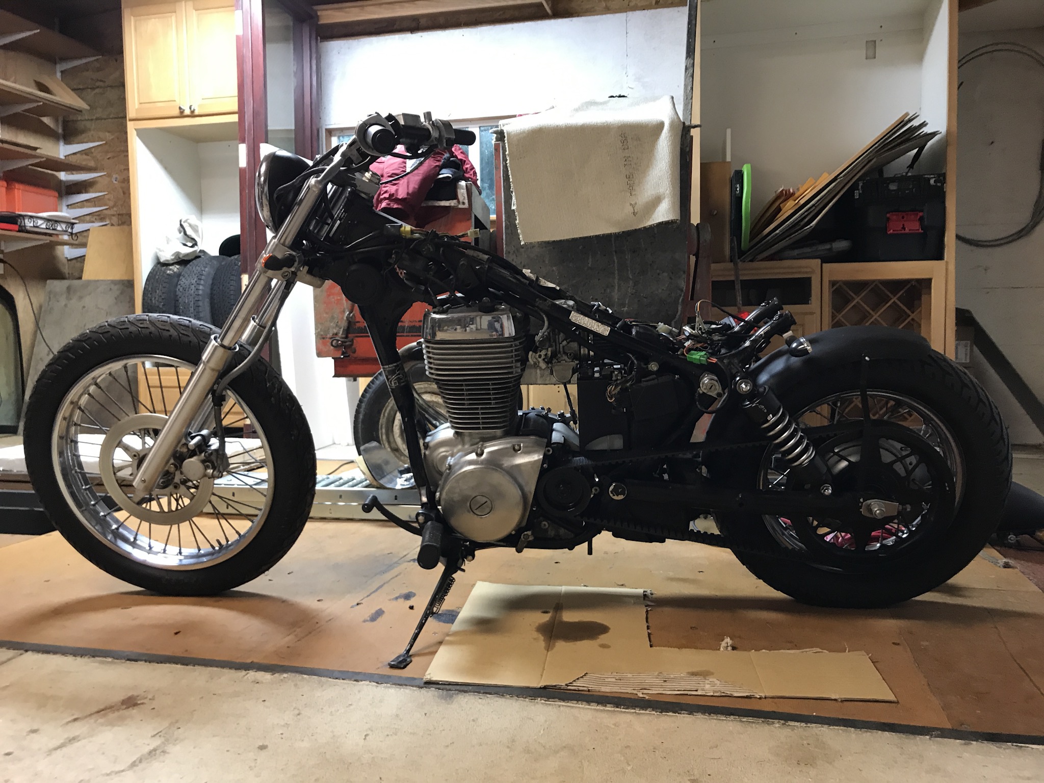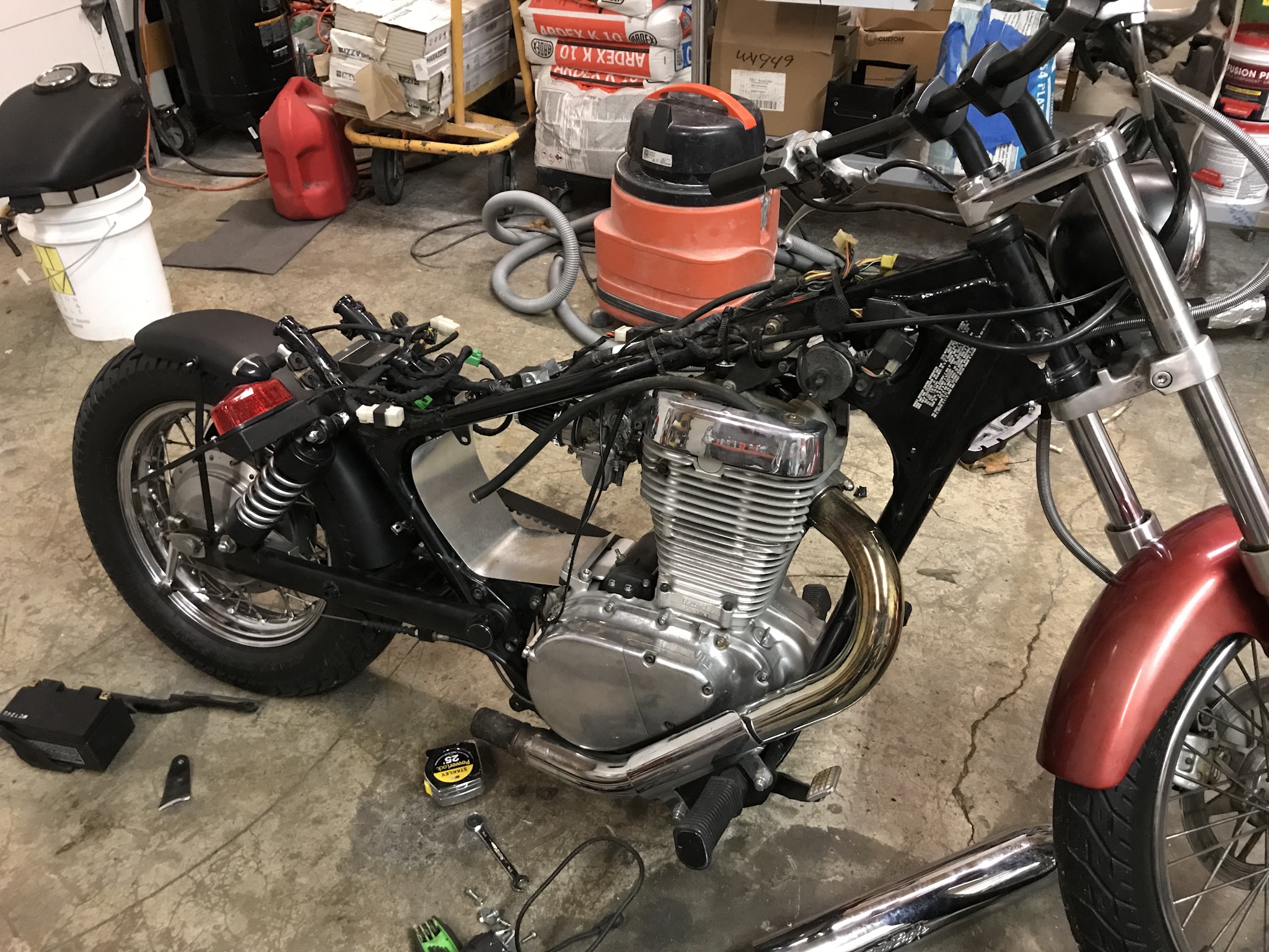 I stuck with this look. I was going for a minimalistic approach. Get rid of everything I dont need and improve on what I have. This picture shows some of the progress with the wiring, the new fender, the bracket mock up, and an idea coming to life.
