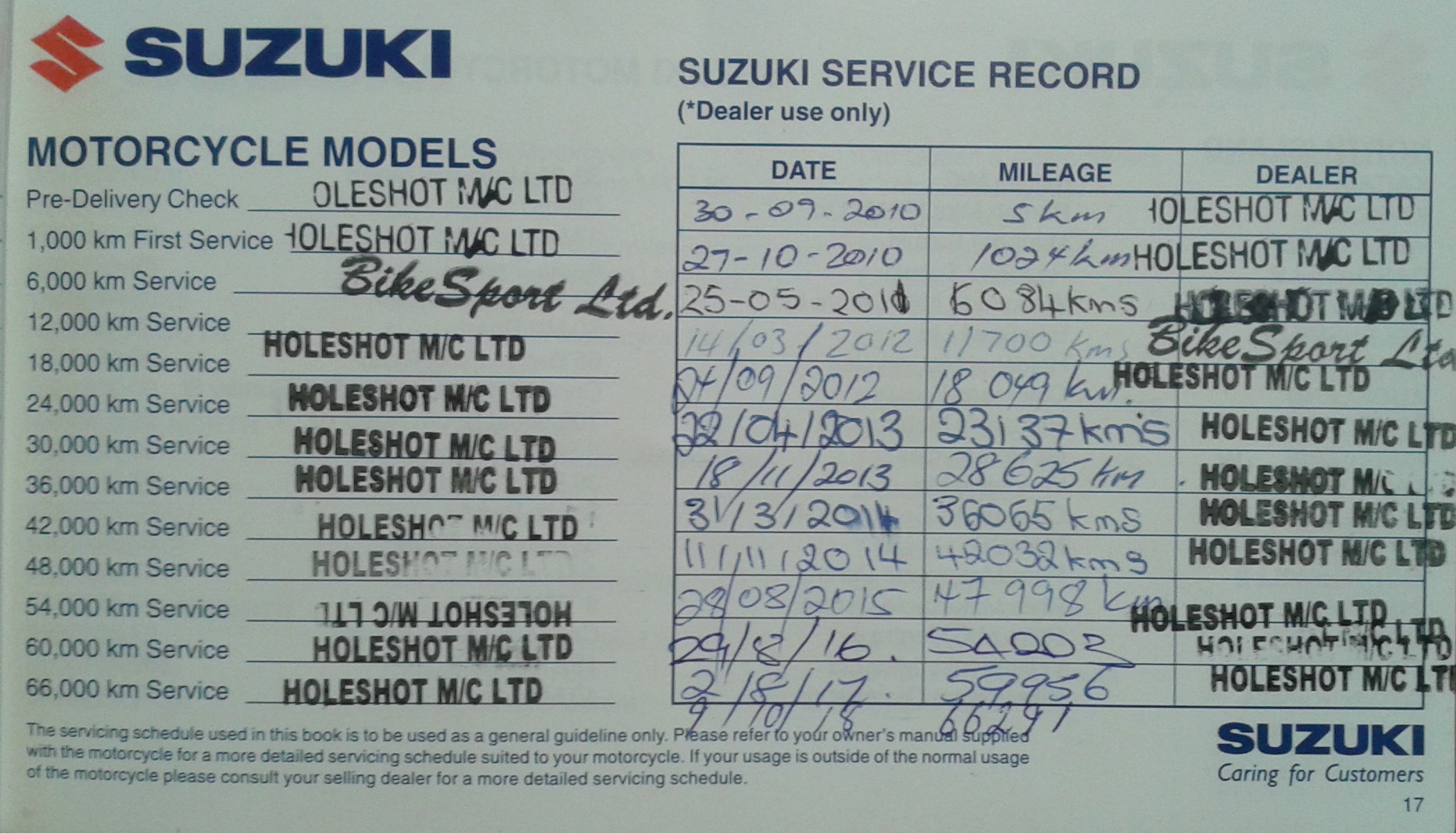 Batman, I can't scan up the entire book but it's twenty odd page warranty, dealer location, warranty exclusion, dealer maintenance schedule, owner maintenance record for DIY people and an ad for Suzuki Genuine Parts.