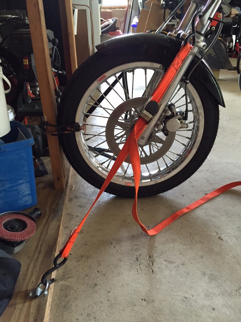 Well, I found that I on my own cannot safely get the bike on the wooden lift I made for it. Usually one of my sons is around and either one just lifts the rear end of the bike and I slide the wood under the motor. Then I put a bag of sand on the seat to keep the rear end down and the front tire off the ground.