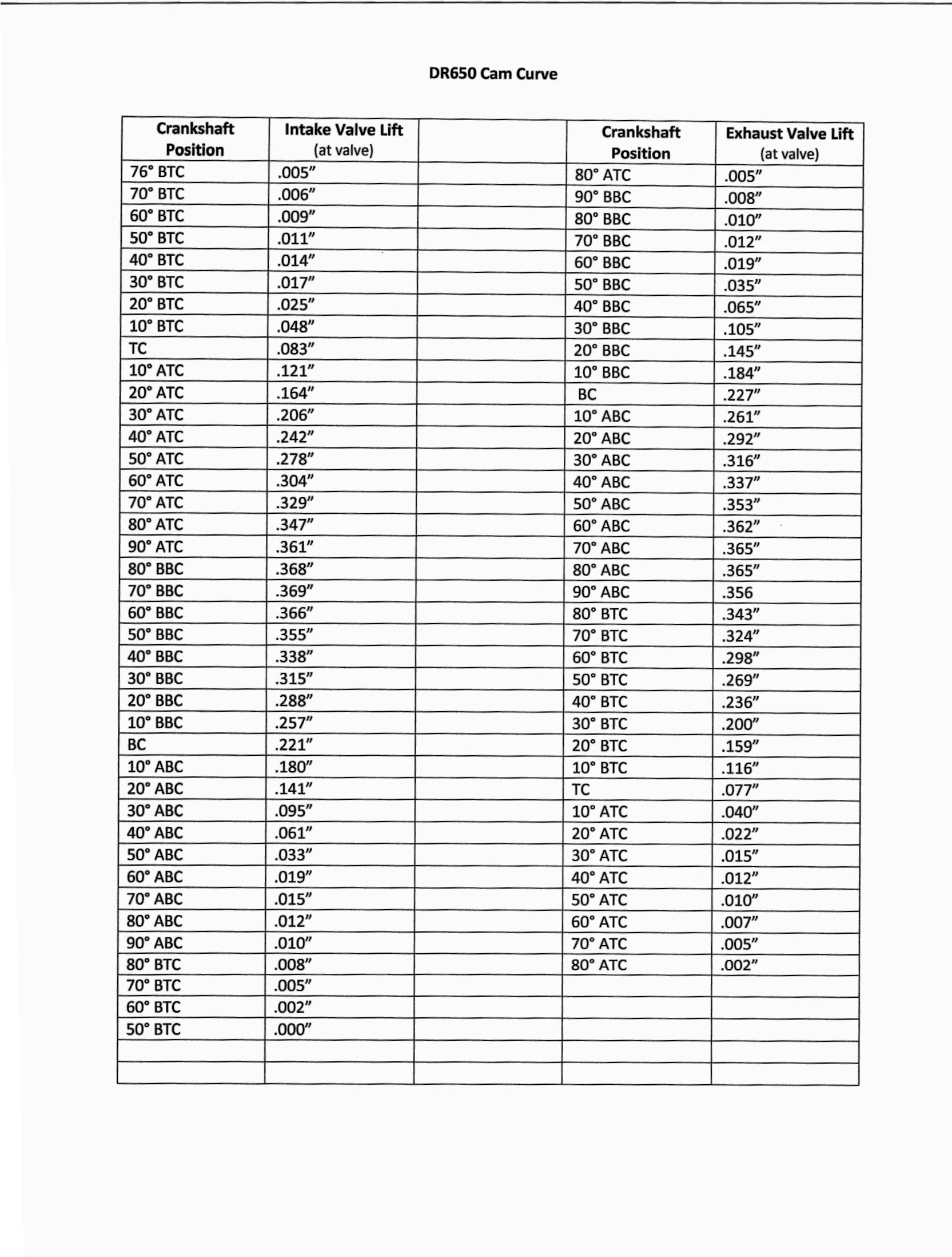 The Stage 1 and the DR650 are almost identical, with the DR cam owning a slight edge. It has more TDC lift and overlap, which should give it a nice mid-range sweet spot. One possible problem with the DR cam is the intake closing point. At 34° ABC it is the earliest closing point for any of the five cams measured. That increases the effective compression stroke and could result in detonation if you increase compression with a pop top piston. The DR cam also does not incorporate oiling holes in the lobes. I am currently running the DR cam and am not experiencing any issues with detonation or oiling. I inspect the lobes periodically and will post any problems I experience on those lines.