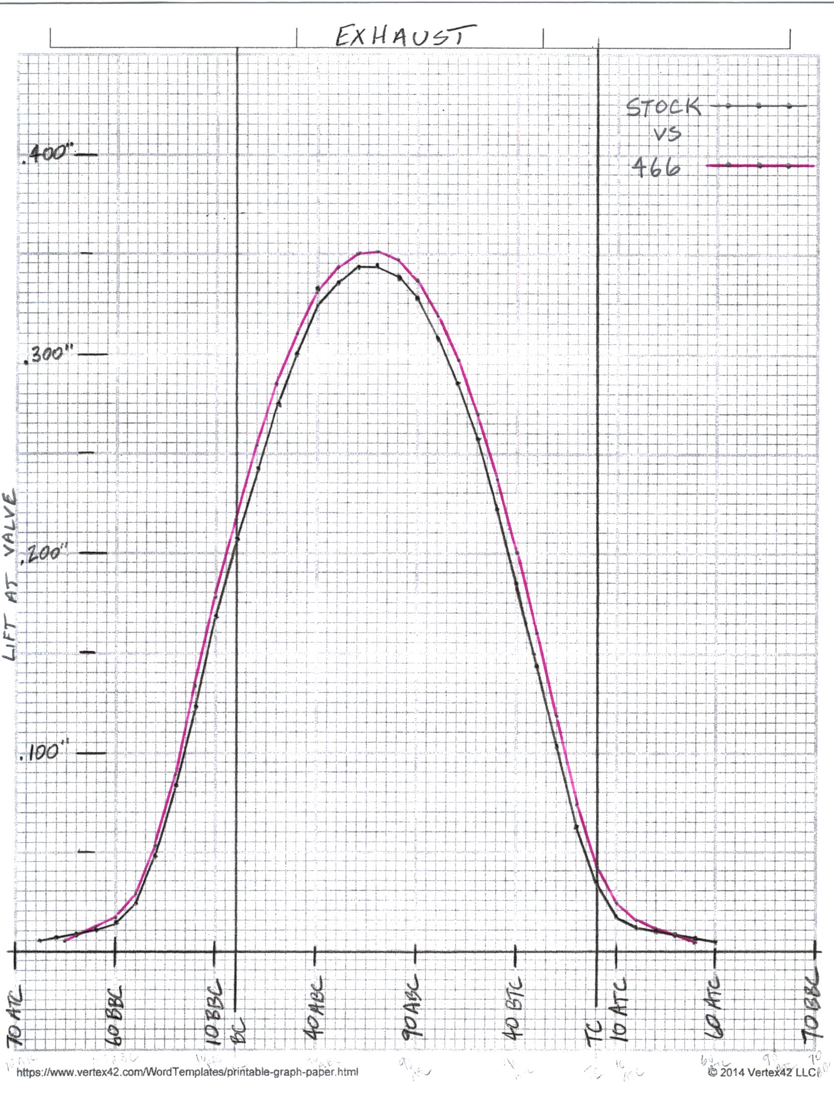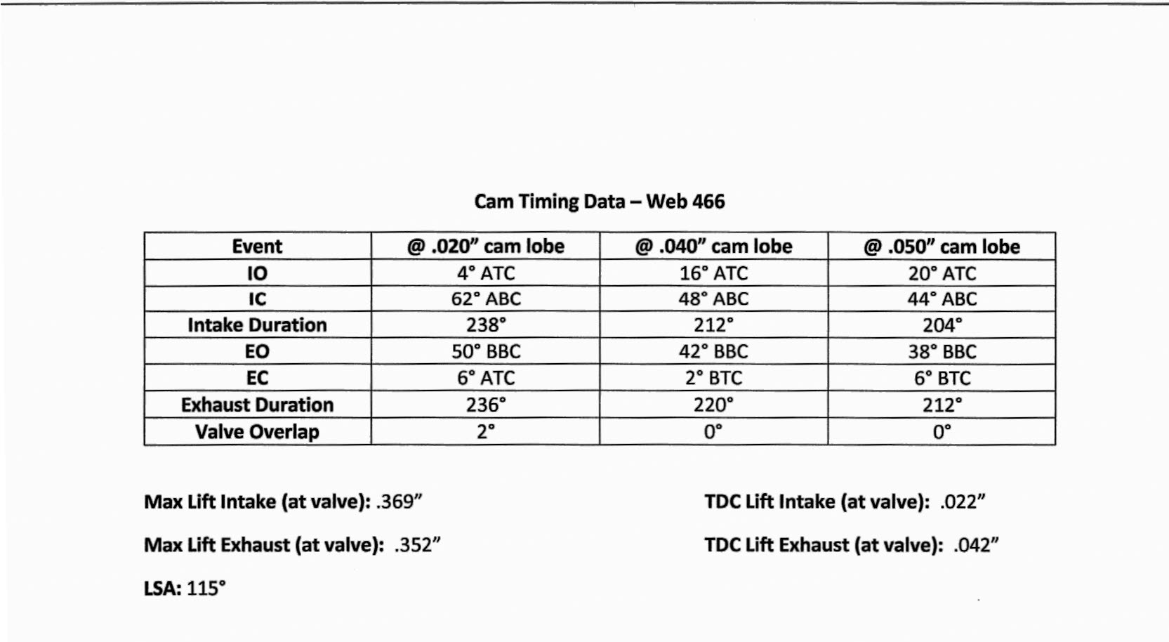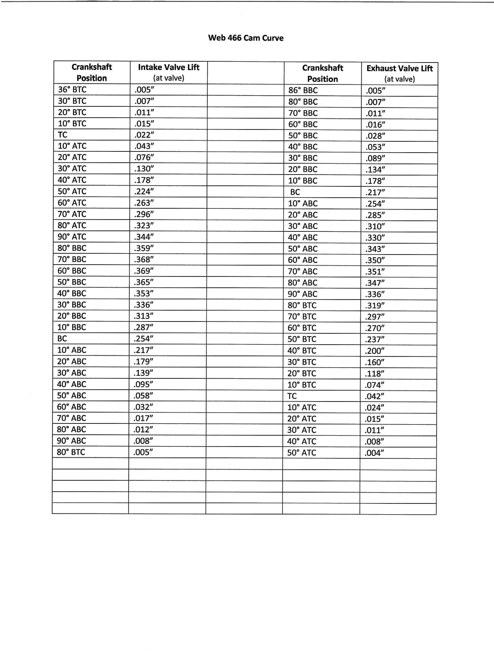 I measured the stock cam, the Web 466, the Web Stage 1, the 1995 DR650, and the Web Stage 3. The stock cam is obviously a low performance item, and the Web 466 is only slightly more aggressive.