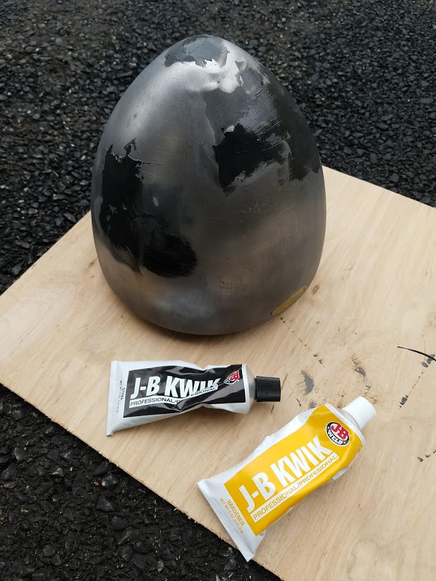 I pounded out the dents, then used JB Weld to smooth out the bucket.  This pic is prior to sanding.  The  JB Weld will allow the powder coat to adhere and will be able to withstand the high temp oven.