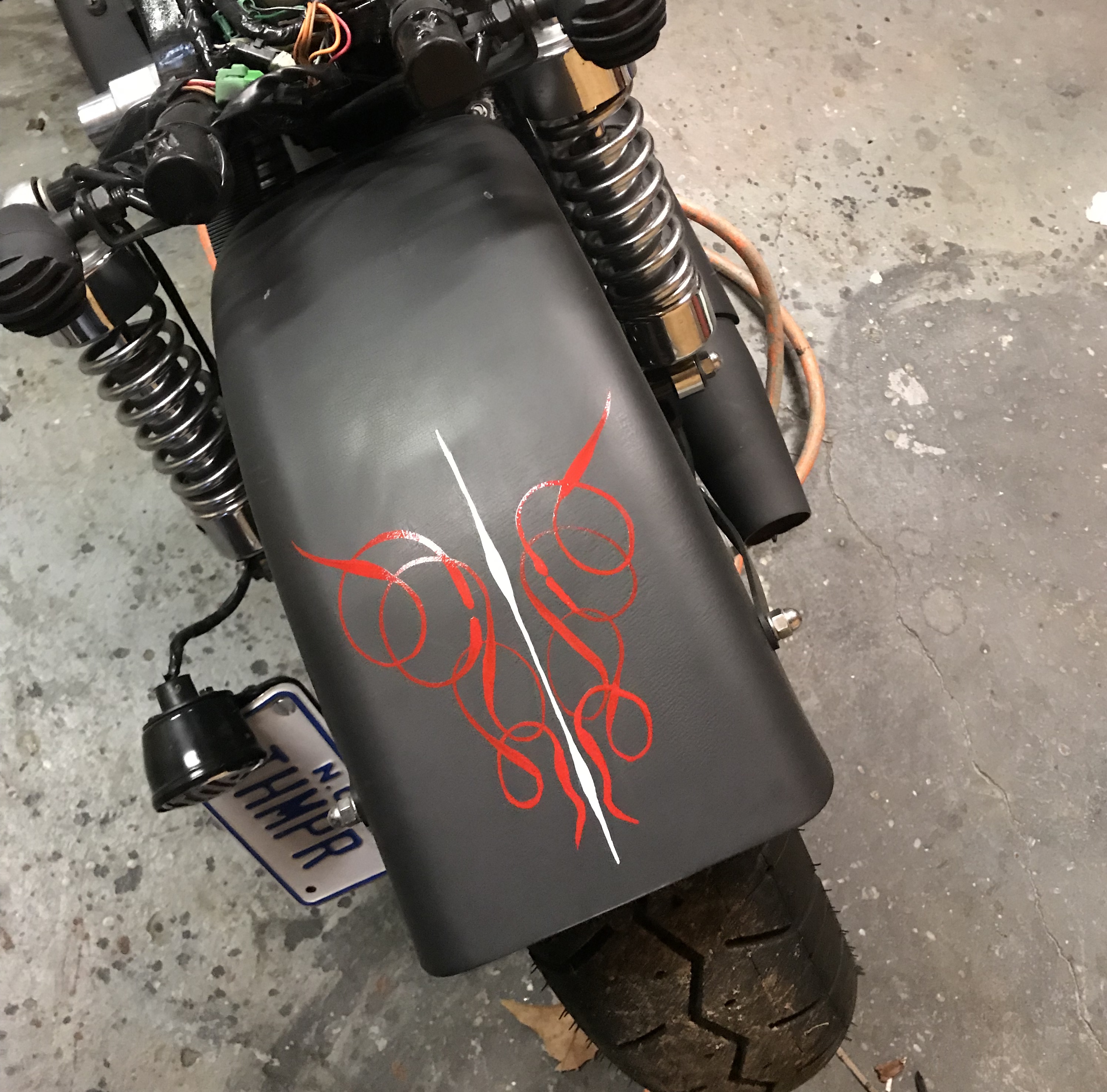 Zook, like the pinstripes, great job!  I also noticed in the pics it looks like you mounted your rear fender without having to weld up any brackets.  Ive been pondering doing something similar since i dont have access to, or know how, to weld. Can you provide any tips on how you did it?  Appears the swingarm was drilled in the back on both sides for mounting struts and in the front for the L brackets attached to the fender.  Did you attach the L bracket to the swingarm with sheetmetal screws in the front?