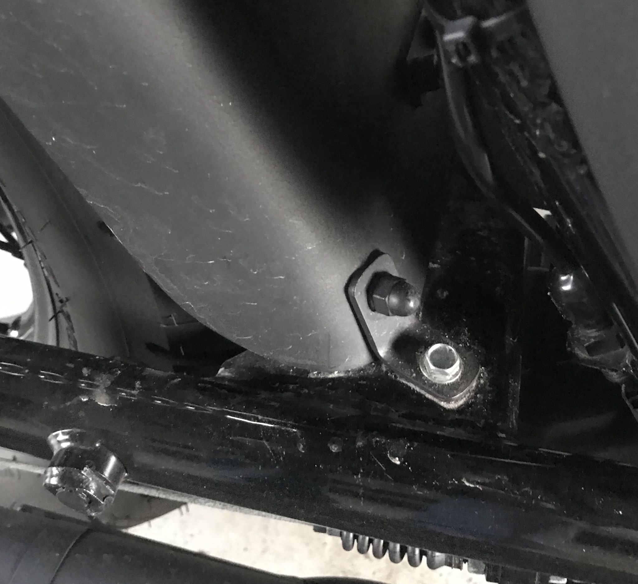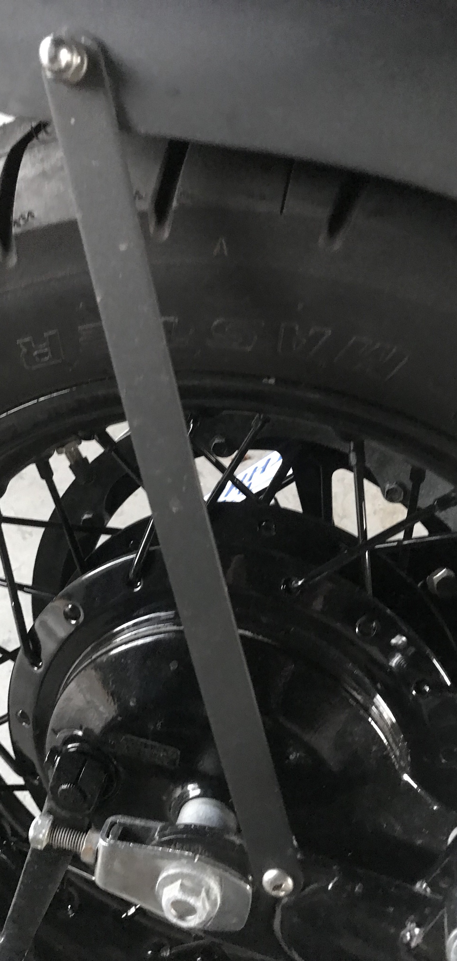 I drilled and bolted the support pieces to the fender and the swing arm near the axle. At the front of the swing arm I made a bracket that bolted to the fender and bolted to the mounting that formerly held the built guard on th left side. On the right I made an L bracket that bolted to the fender and drilled a hole in the swing arm and used a large self taping sheet metal screw.