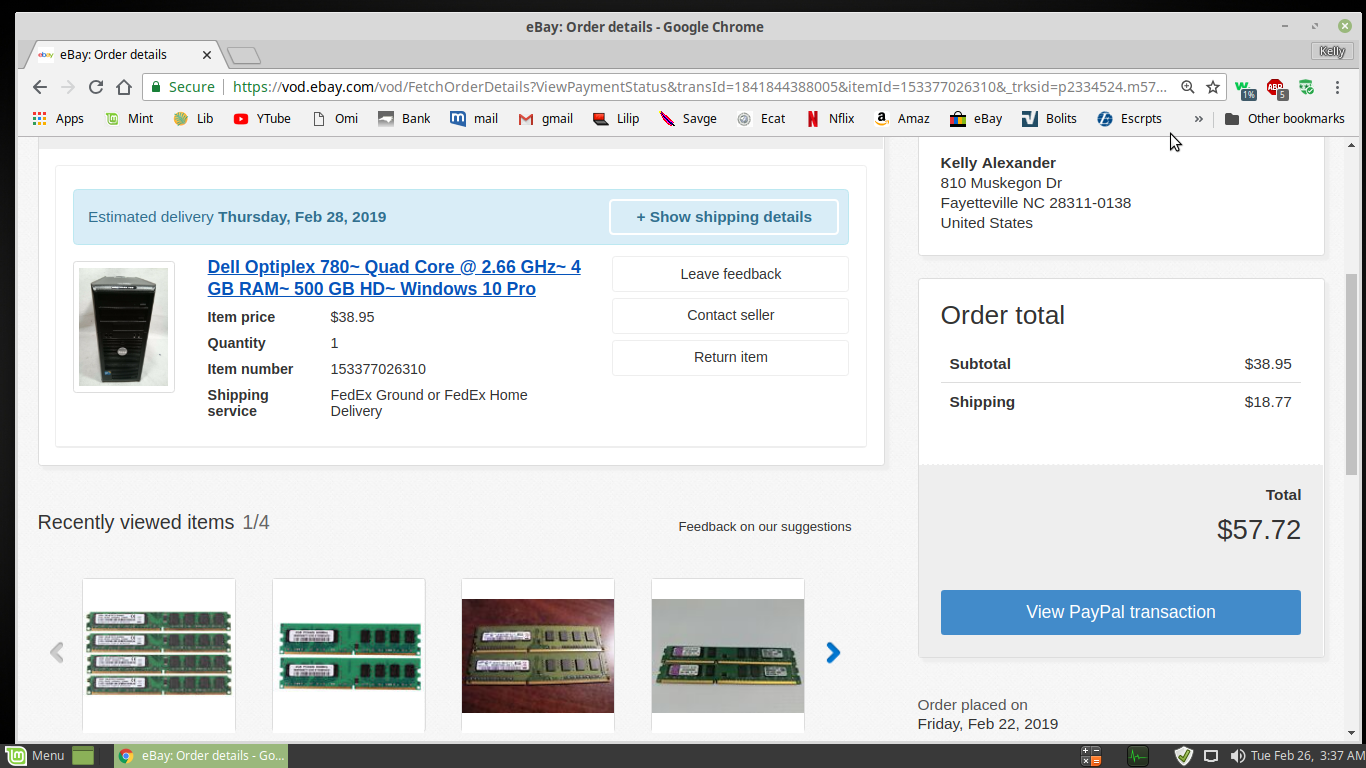 Total with shipping is $59.72 and I can pack it slam full (8 gigs in total) of memory for an additional $13 shipped but I will wait on that as Office 2010 doesn't require but 2 gigs and it has 4 gigs in it already as shipped.
