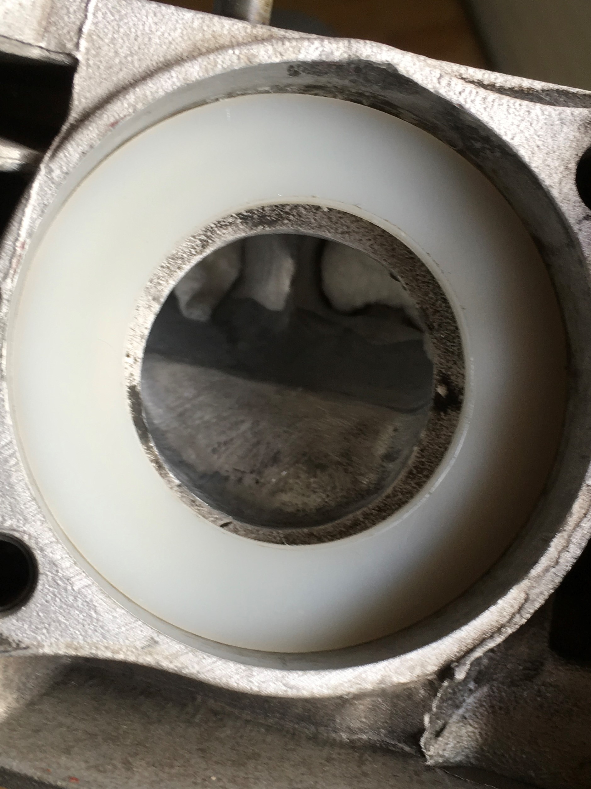 I purchased a large nylon washer and cut the outside diameter to fit snug in the exhaust socket.  Then I cut the inside diameter of the washer to 1.5".  I used the washer as a template for enlarging the port opening from 1.3" to 1.5".  The template serves as a guide so that your finished opening is centralized.  I suggest that you not remove material from the bottom of the port.  It should remain flat.  You end up with an opening that is sort of like a capital "D" laying on it's side.