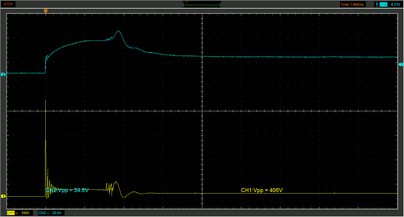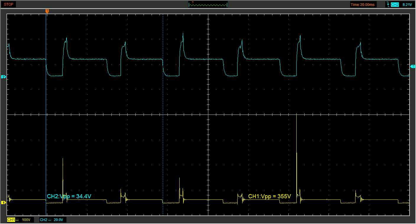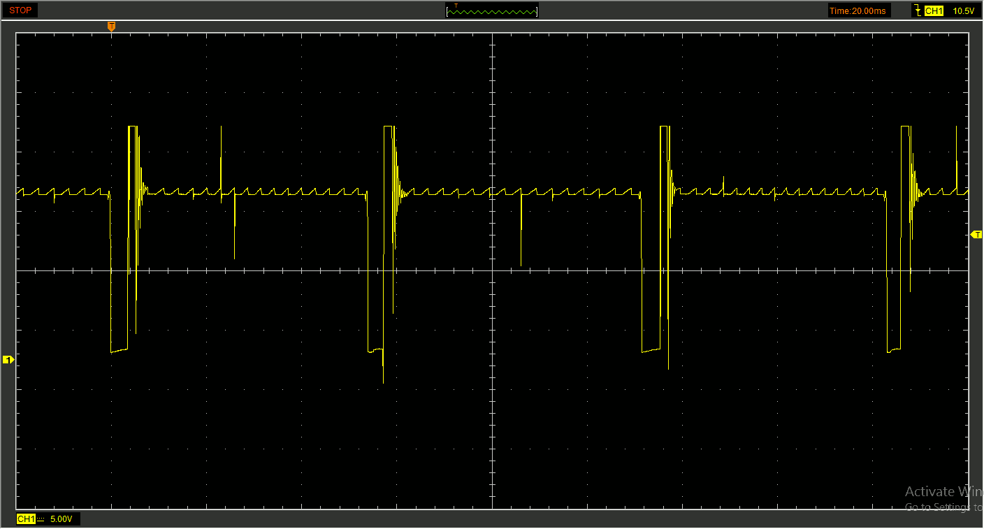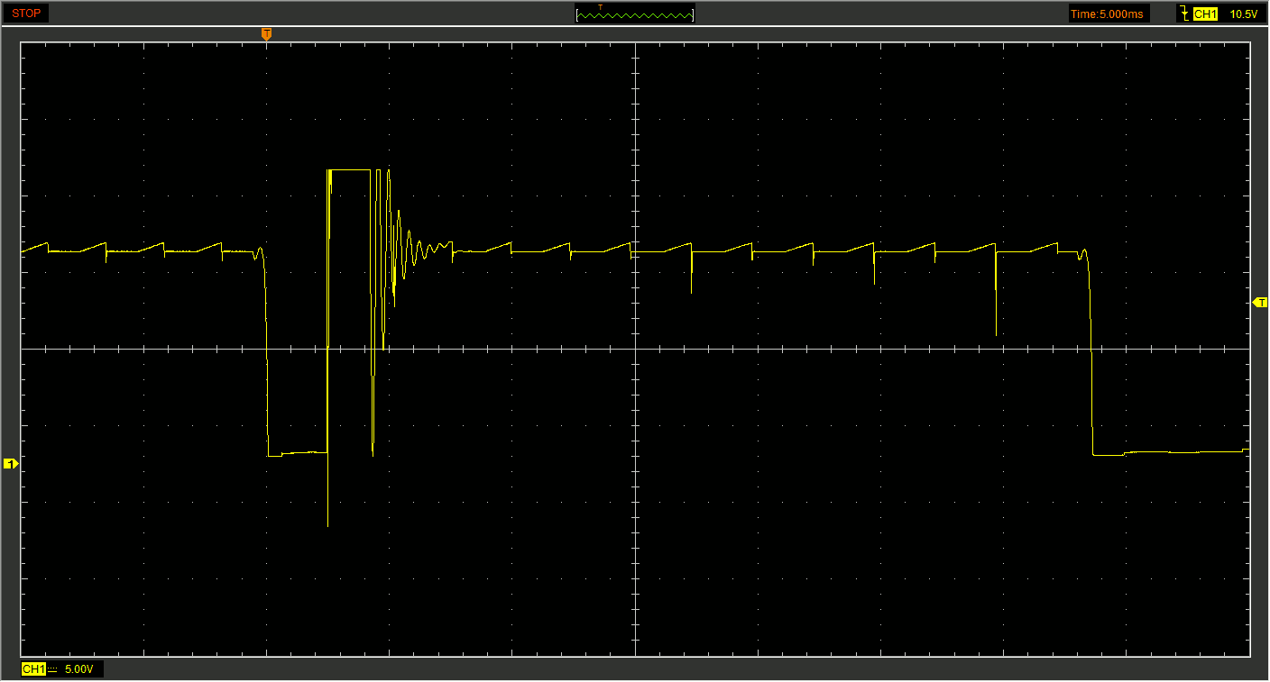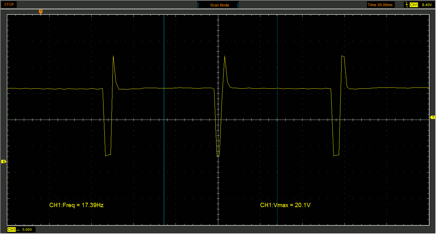 Oscilloscope view with proper 20ms time base. The first image looks like a 20ms also, but the actual time base was 500ms