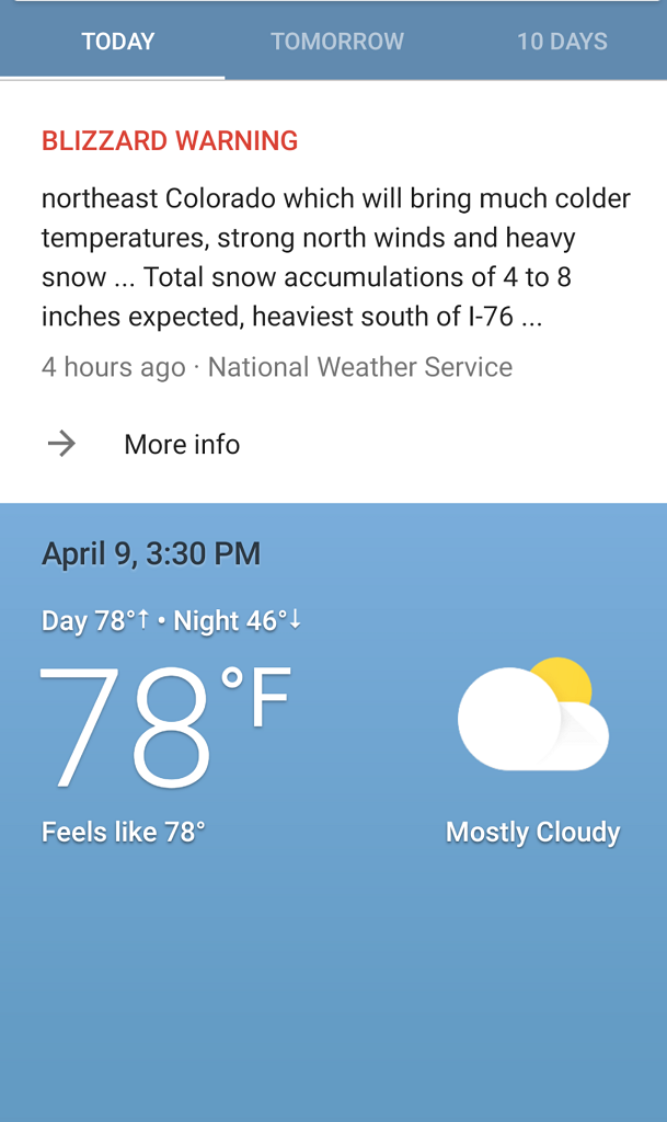 Nearly 80 today. Blizzard tomorrow. Just had an automatic email and phone message from the hospital on my cell about severe weather predicted tomorrow from Cheyenne, Wyoming to Colorado Springs. Heavy rain by midday changing to heavy, wet snow with ~10" possible and strong wind.