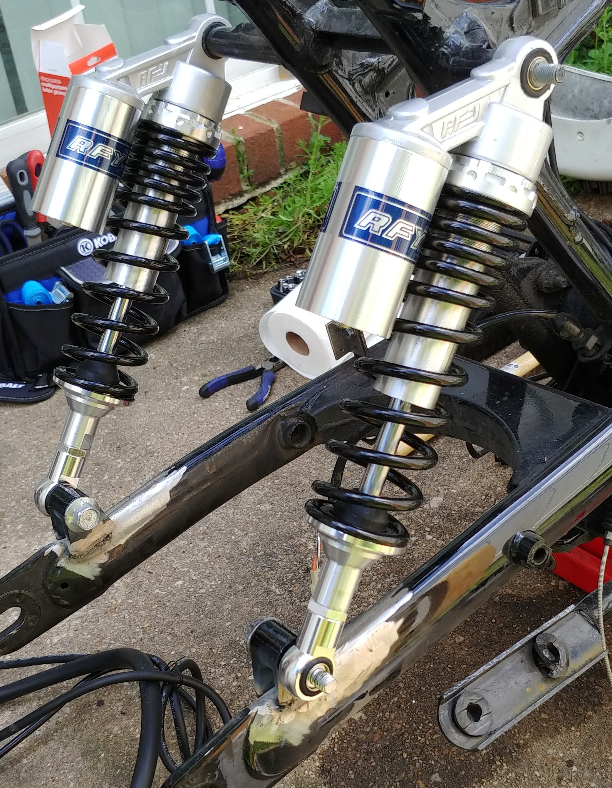 Tabs tacked and shocks temp mounted. With no one on the chain just barely clears the swing arm, with my wife on theres a bit more and with me on I expect a couple more mm of clearance. This is running 18/52 and not properly tensioned, close enough to get about an inch and a half of slack though. Does that sound like enough headroom? I could shorten the mounts moving the bolt slot "down", probably would give me another mm or 2.