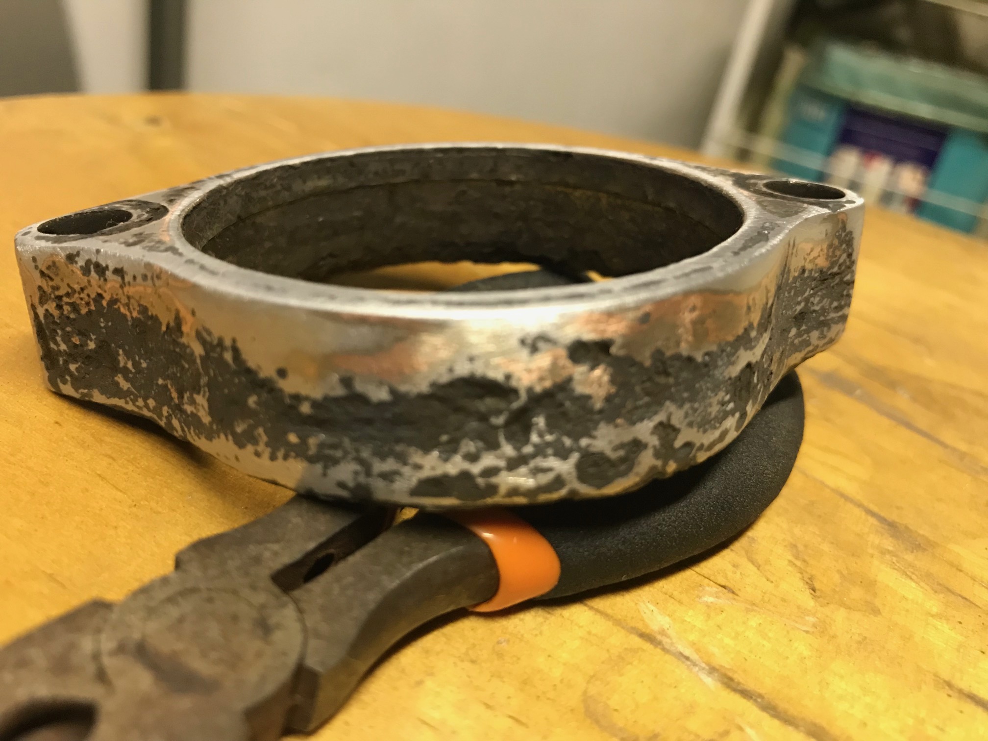 On the bright side there’s nothing mechanically wrong with the clamp. I’m gonna own my mistake and put the header-clamp-of-shame back on my bike. It doesn’t look any worse than my crankcases after the past couple harsh winters. And I got that nasty cloudy chrome off. Couldn’t stand looking at that.