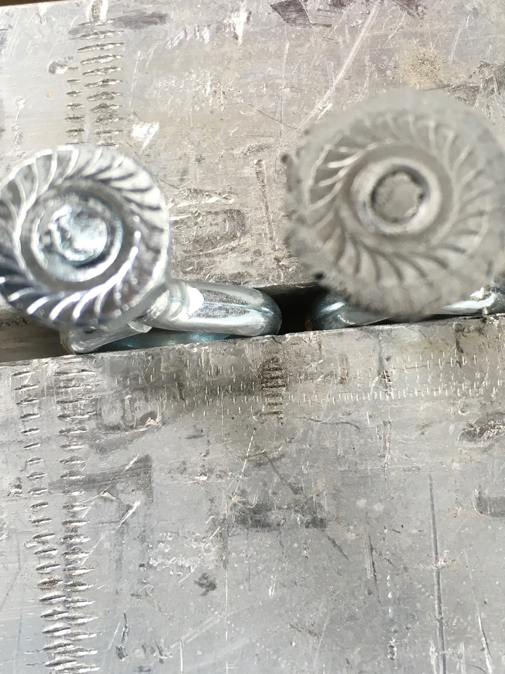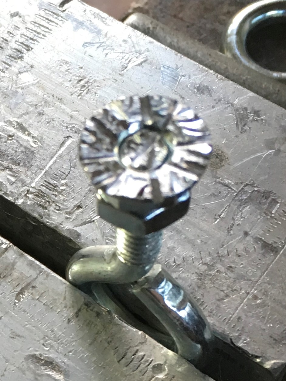 I used the High Heat product and started with a specimen that had no anchor profile, just the plated surface and serrations on the flange nut.  I suspended weight from the test specimen in five-pound increments.  The bond line failed at 50 lbs.  The flange nuts have a surface area of .26 square inches so that works out to 192 psi.   I did this test to demonstrate what I don’t want.  I want the epoxy material to fail, not the bond.  You can clearly see that the epoxy pulled completely away from the serrated nut.