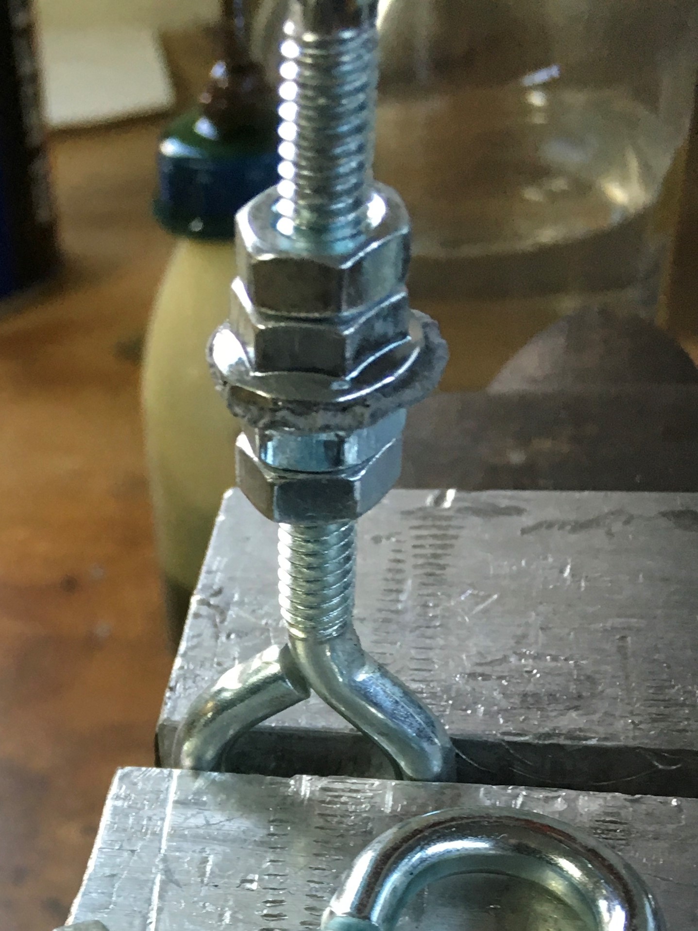 My adhesion test uses two eye bolts with flange nuts.  The flange nuts were prepped with an abrasive cut-off wheel to provide a good anchor profile, then I cemented the two assemblies together and let the product cure for two days.  Then I baked the specimen in the BBQ at the appropriate temperature (450°F for the epoxies and 600+°F for the Extreme Heat).