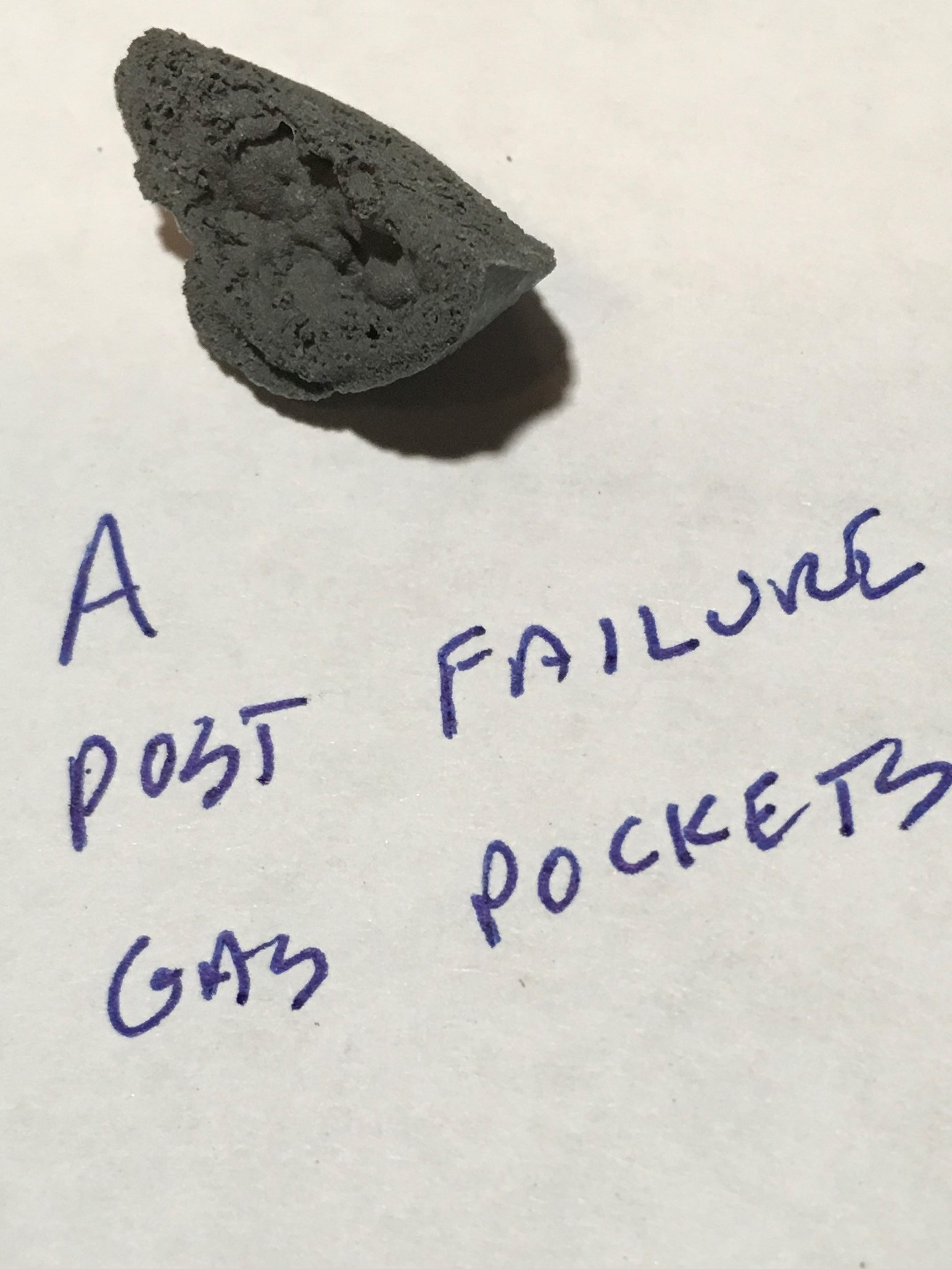 I did another test on the Extreme Heat to see if it becomes insoluble at lower temps.  I baked a specimen at 250°F for two hours, then placed it in a jar of water.  It didn’t dissolve, and it was still hard as rock after the soak, but when I pressed on it with my thump it popped right off the test angle.  I’m not likin that.  Here’s how the stuff looked.  I’m not likin the gas pockets.