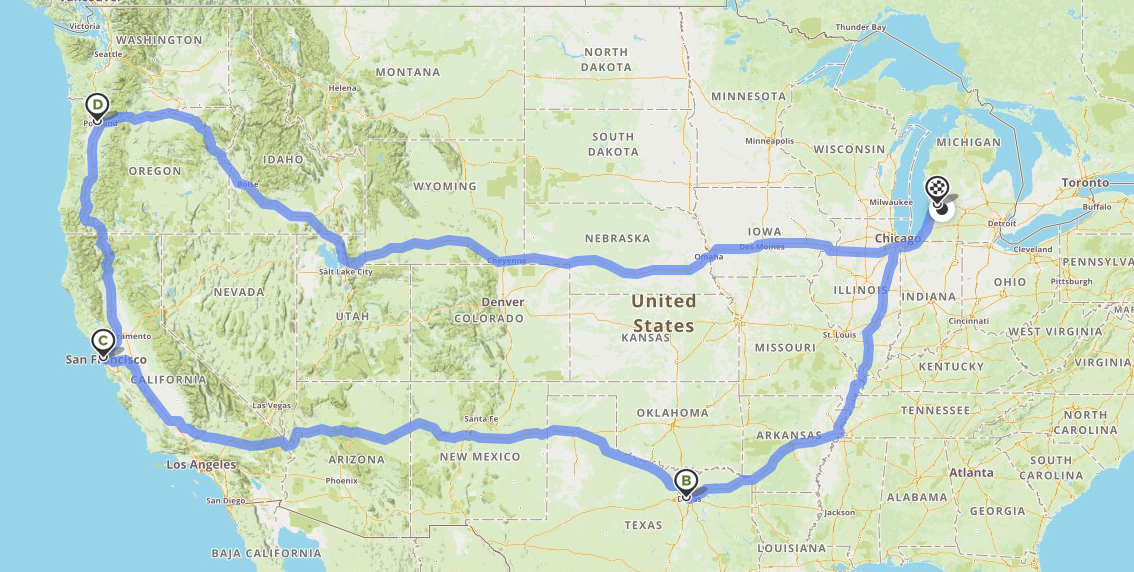 Michigan to Dallas, TX to San Francisco, CA to Portland, OR, a hop up to Seattle then back home. Will definitely be a mix of highway and state roads, but man oh man I'm excited to see everything along the way.