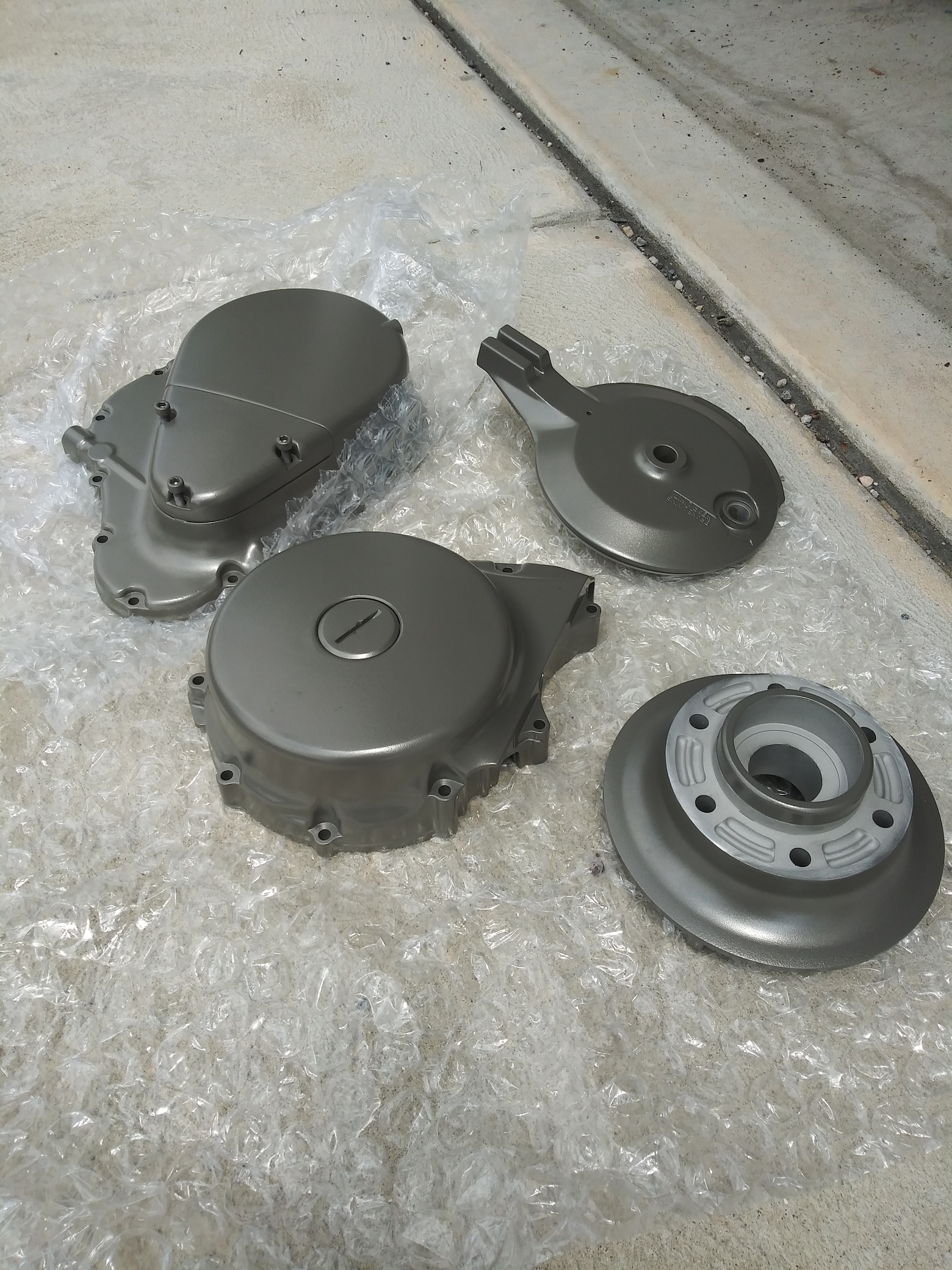 Rode up to the poweder coating place and picked up my pulley hub and rear brake cover. They came out great! Those two parts are the same metallic grey as the crankcase covers. I can't wait to get all this stuff on the bike. Getting closer. Got the Barnett clutch kit so last pieces of the puzzle are the modified cam chain tensioner and some gaskets.