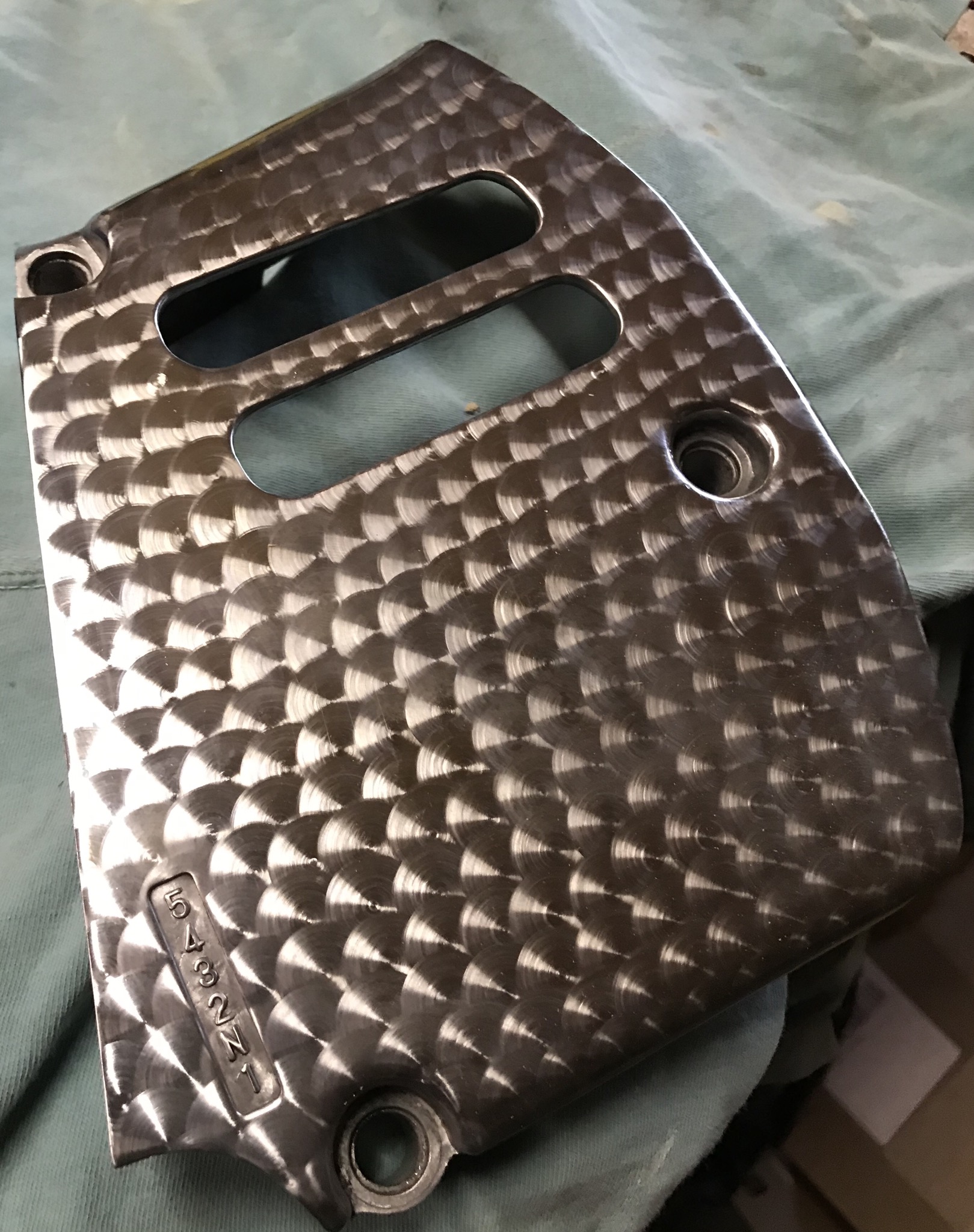 I am planing on refinishing my crank case covers so I was experimenting on the pulley cover and did this today. I don’t have a rose engine but with and end mounted bristle buff mounted in a flex shaft and some greasy sand I came close.
