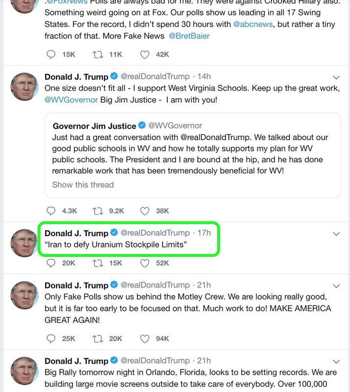 WTF is it supposed to mean. It's like he just heard it on Fox News and it's like he just then said to his mate at the pub who just got back from  the toilet... "hey, Iran is going to defy the stockpile limits".