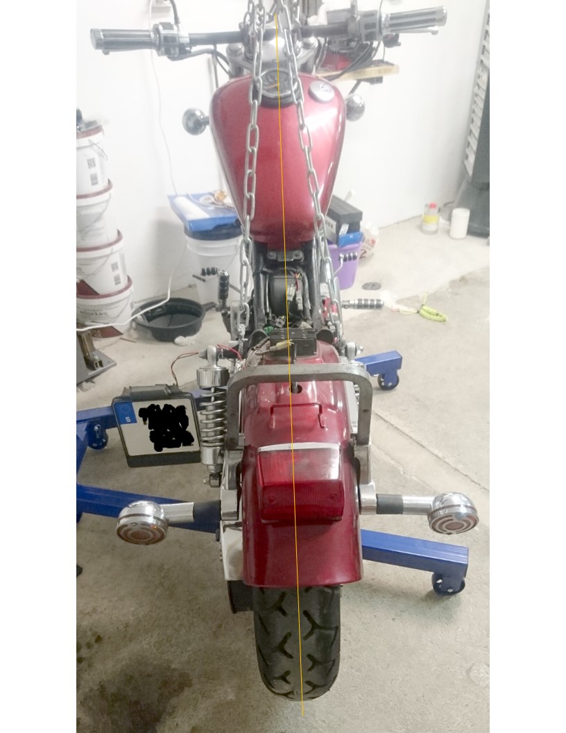 Look at your photo with the line that I have attached. The line starts at the steering stem, goes through the center of the tank, the center of the frame, and then the center of the tire. What is out of whack the "sissy bar" or whatever you want to call that contraption. It's clearly cocked to the right, taking the fender with it. Note that the wire through-hole at the center of the fender is right of center.