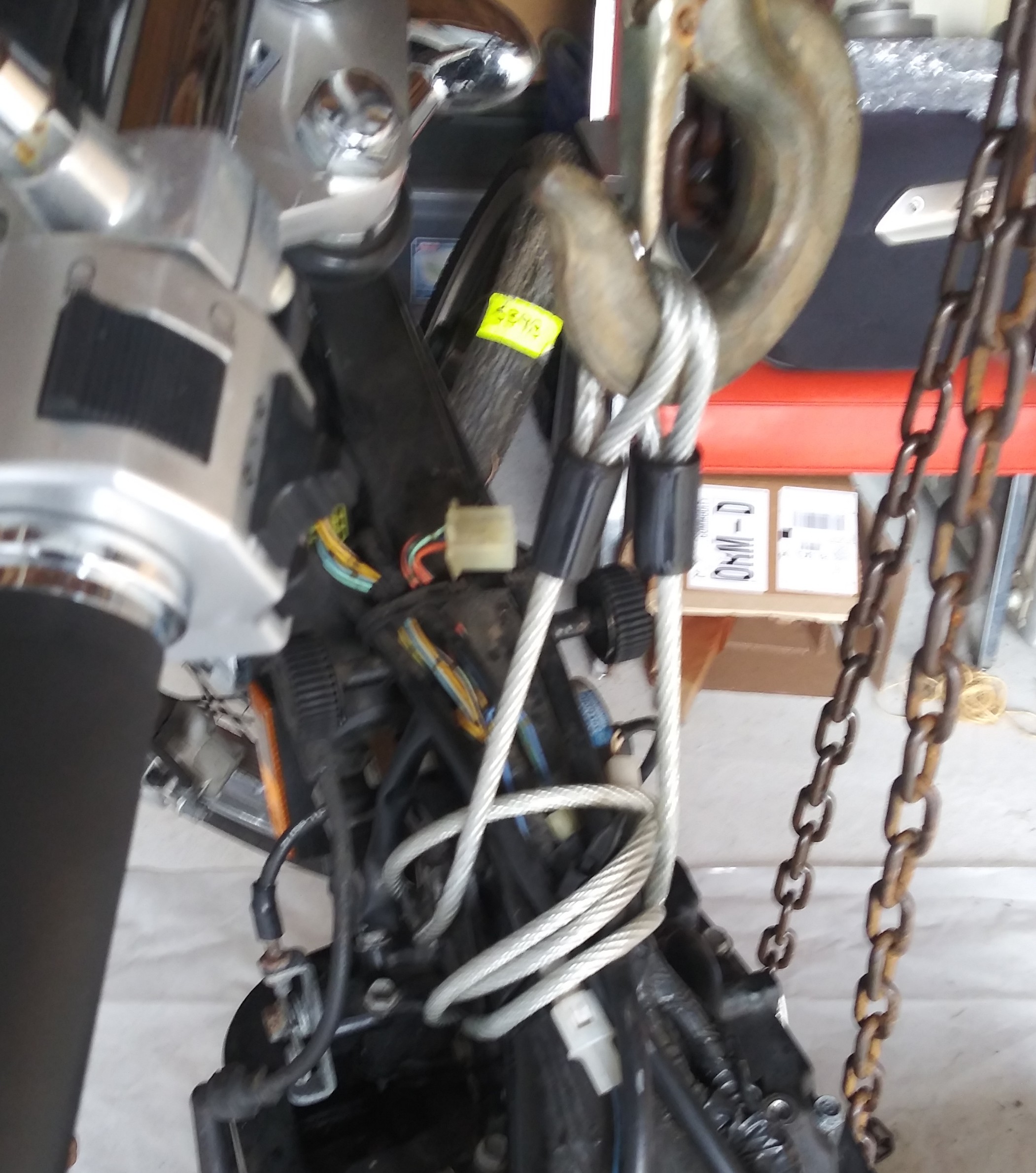 Do I take off the gas tank and hook ratcheting straps between the frame and the overhead joist in the garage to lift the front of the bike high enough?