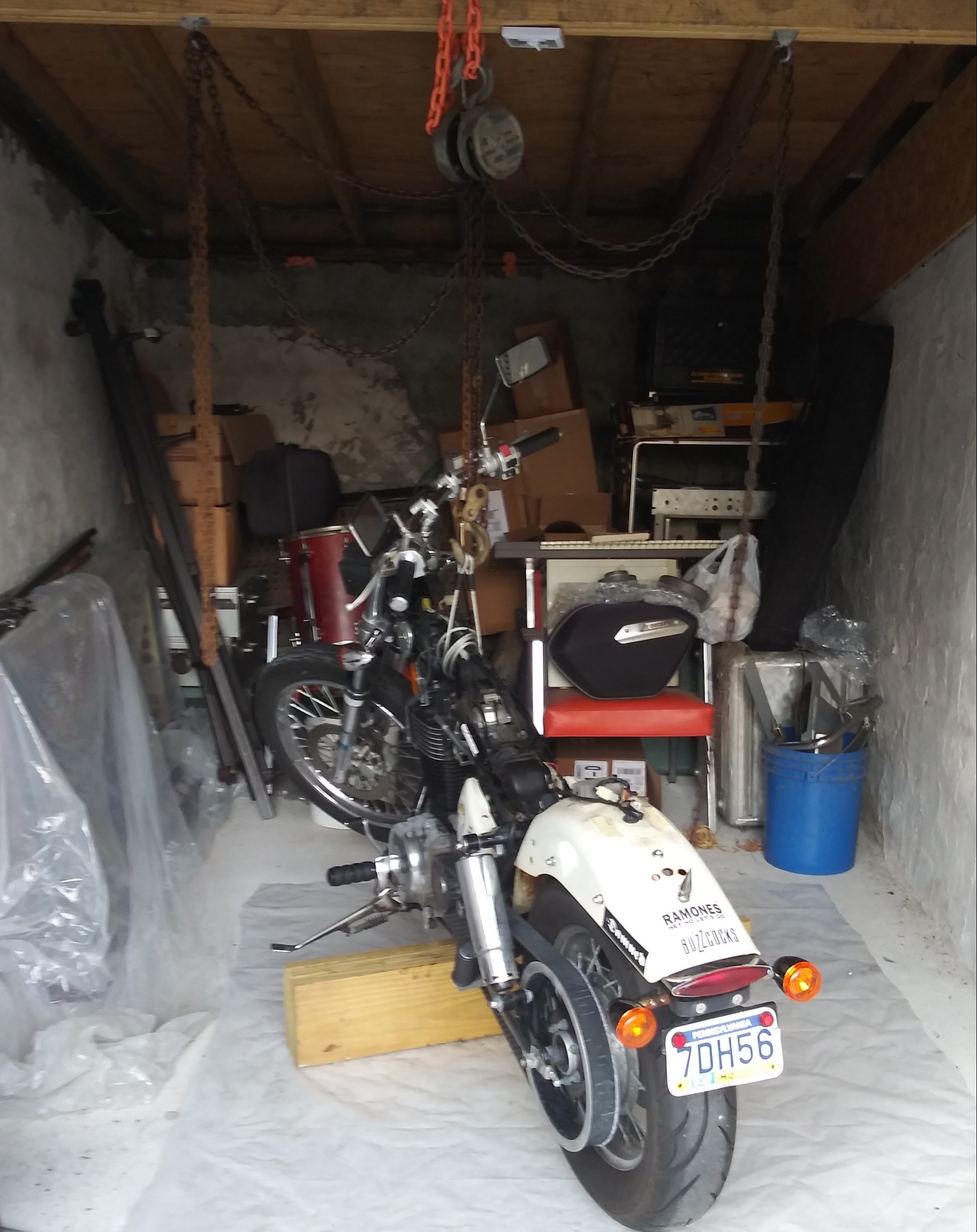 I used a Come-Along to hoist the bike in the shop and set it down on a cinder block. I used a thin wooden shim to make it solid. While I was doing things that could upset it I kept the hoist connected and just barely snug.