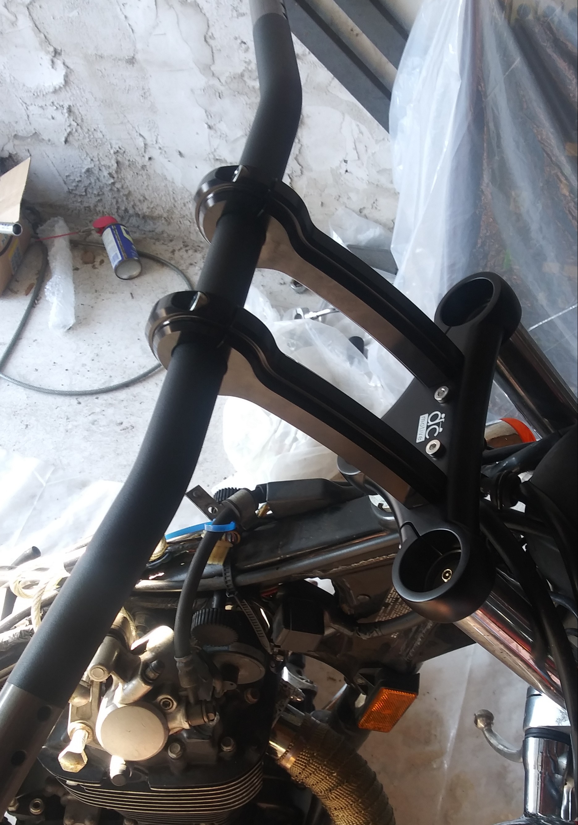 This is the new setup. The risers are the same height and pullback as the OEM risers. But the handlebars are much wider with a little more pullback than the original dragbars.
