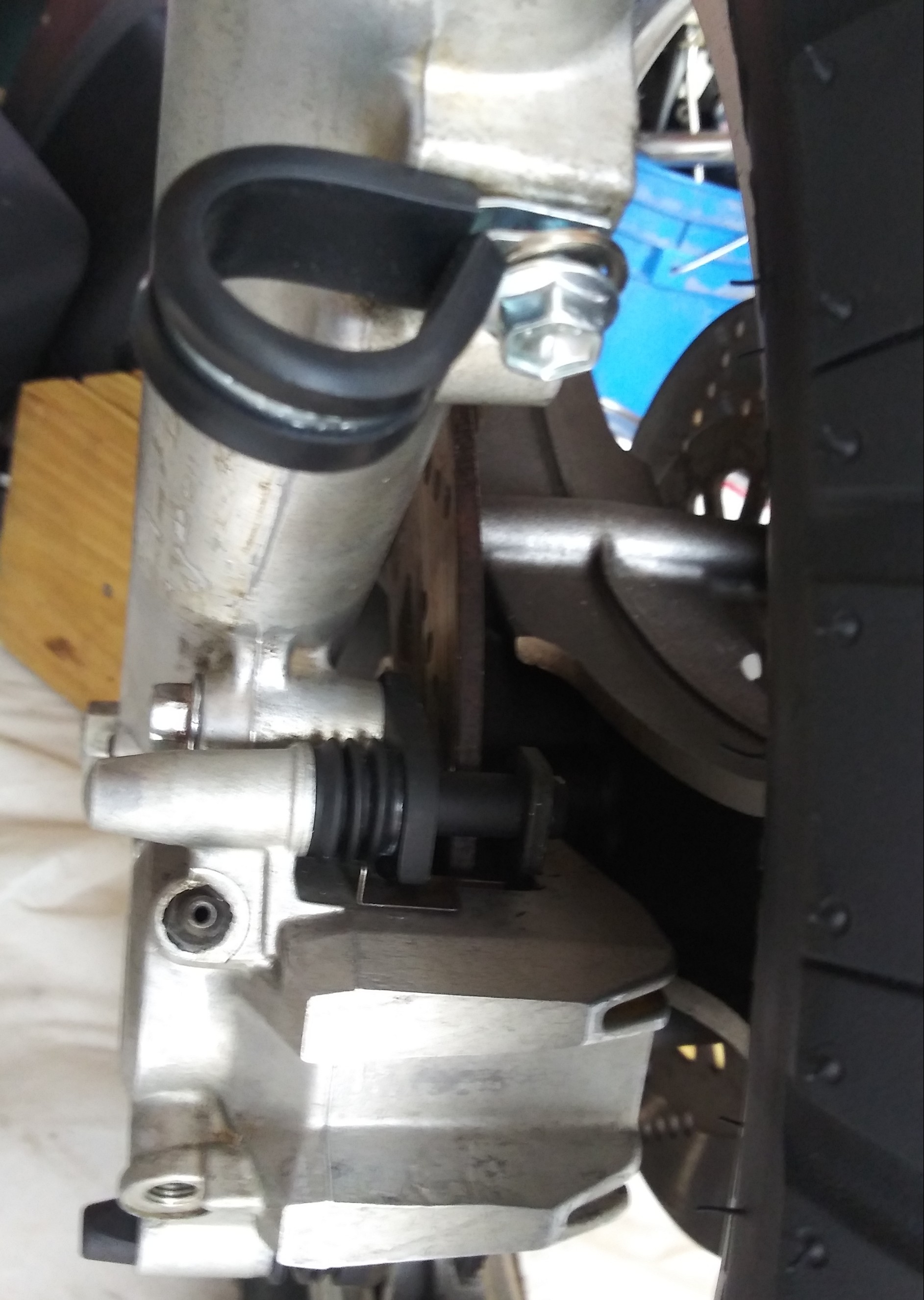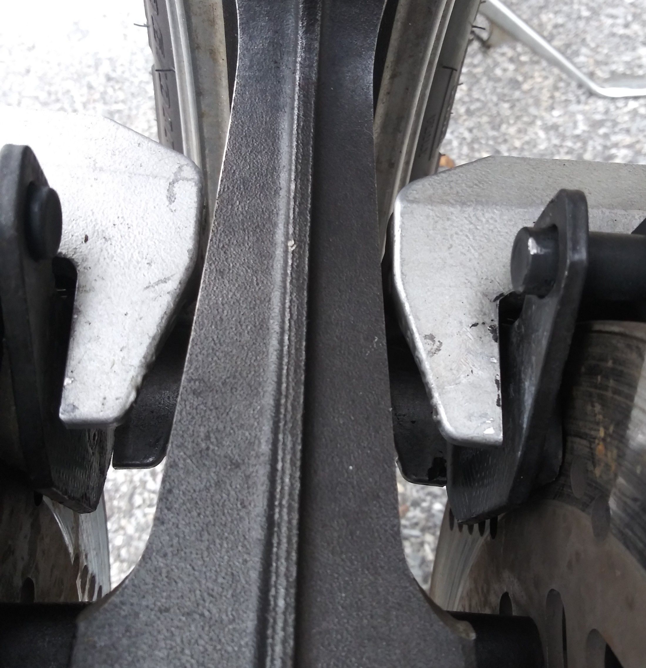 Time to finally put on the brakes. Had a moment of pause though. Measuring from the upper caliper mount on the fork to the outside of the rotors came up with different measures. 14mm on the right and 12.5mm on the left. I nearly freaked out but there's alot of possibilities here and the measuring technique was tongue in cheek at best.