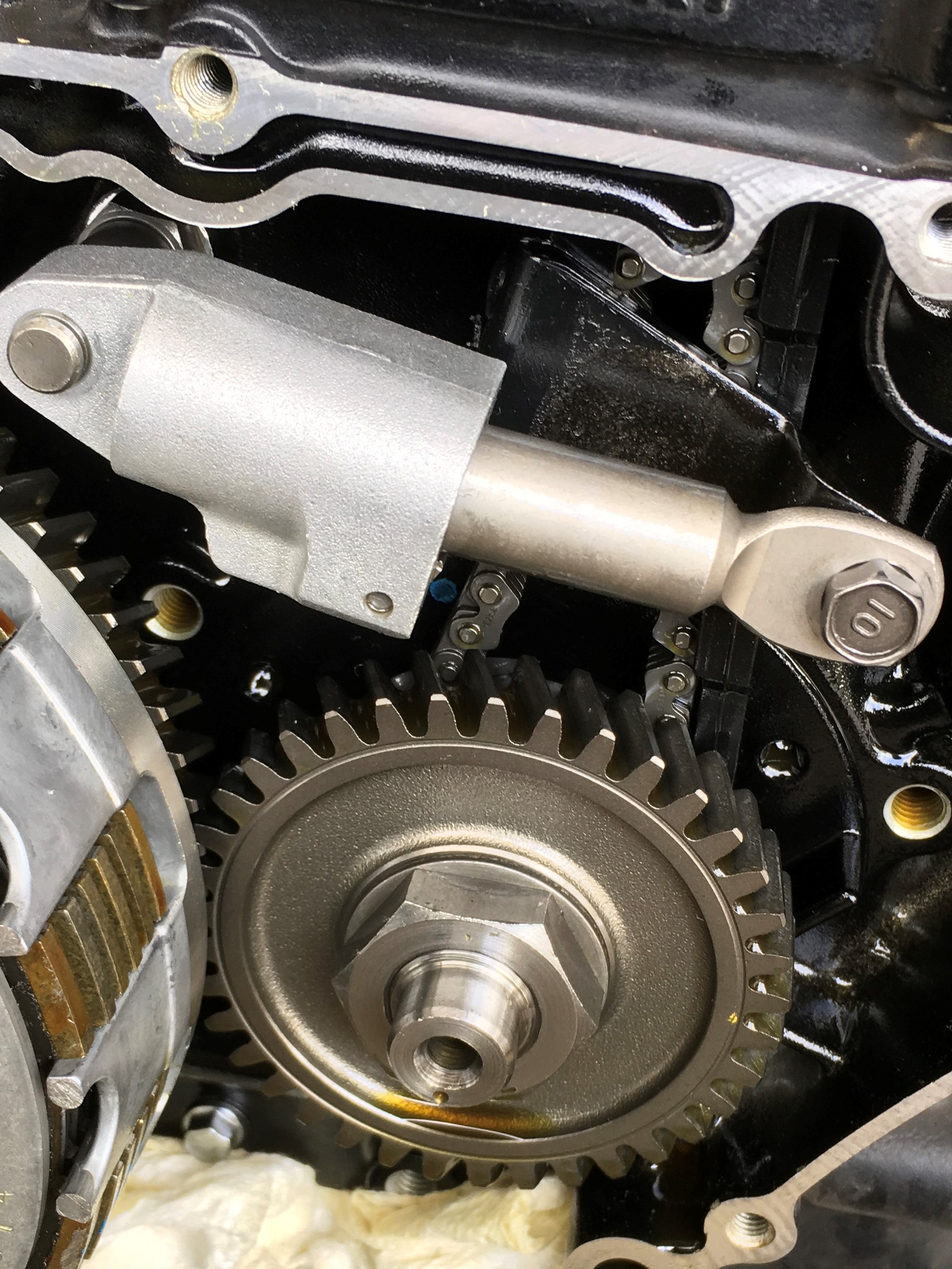 And of course, the situation at the cam chain tensioner was dismal at best.  Not only was the tensioner plunger extended to 27mm (very bad), but the drive & slack sides of the chain were dangerously close.  Look at the chain just above the tensioner.  This would have to be corrected.  The Verslagy tensioner mod can only do so much.  I’m fixin to drop this head another .005” from where this photo shows.