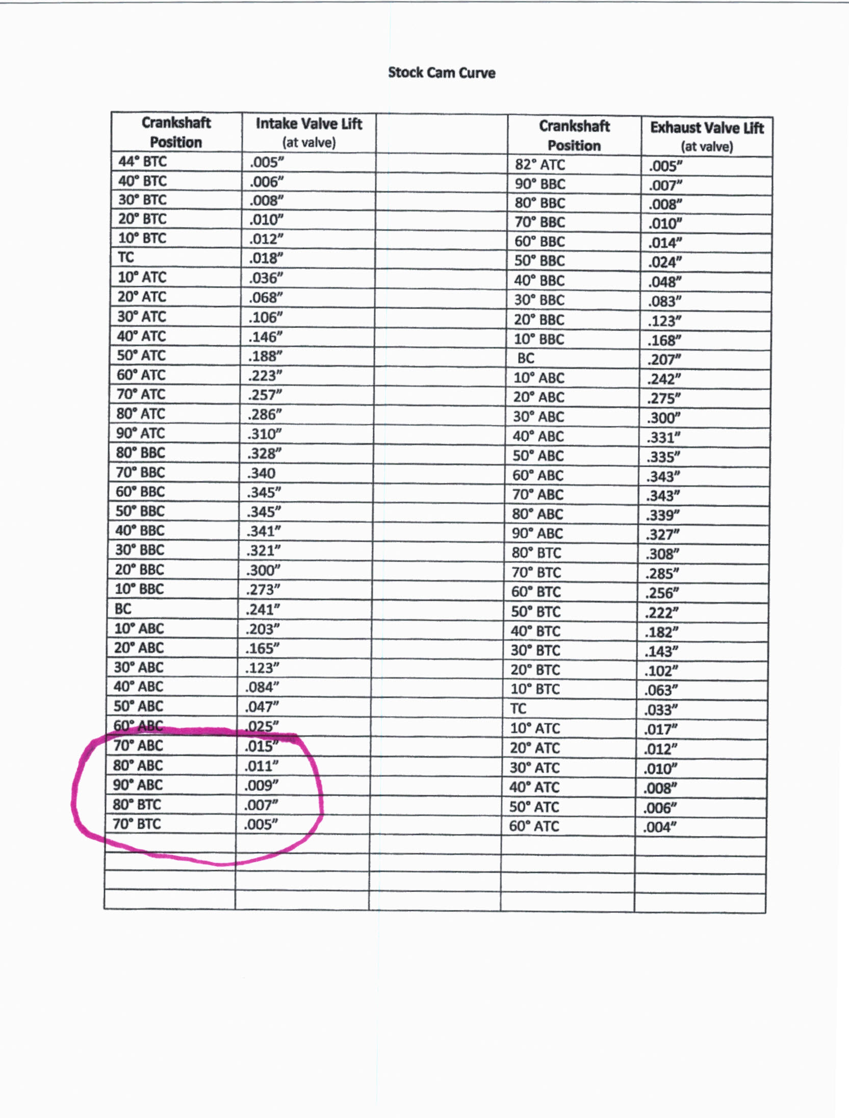 Regarding cam timing.  Using the tried & true direct measurement method, the stock cam puts the intake valve on the deceleration ramp at 70 degrees after BDC.  At that point, it is only open .015".  From there, it gradually places the valve on the seat, and the valve is on the seat at 70 degrees before TDC.  For all intents & purposes, there really isn't anything flowing through the intake valve once it enters deceleration at 70 degrees ABC.