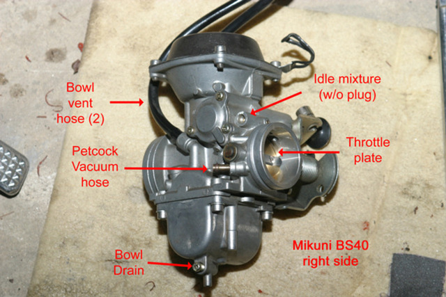 -I tried messing with the air/mix screw on the right side of the carb (tightened it and then rotated it CCW for 2 full turns to start, when that didn't work I loosened it more, that didn't work either, so I tried tightening it.. which made the bike shake more)